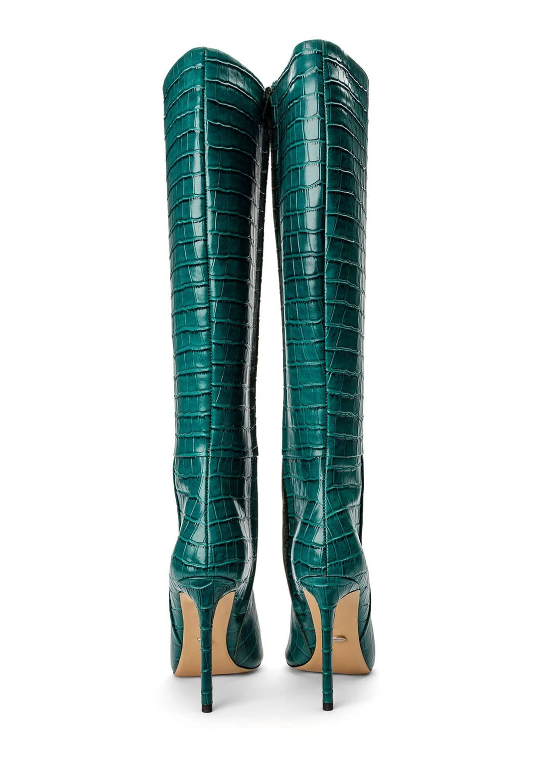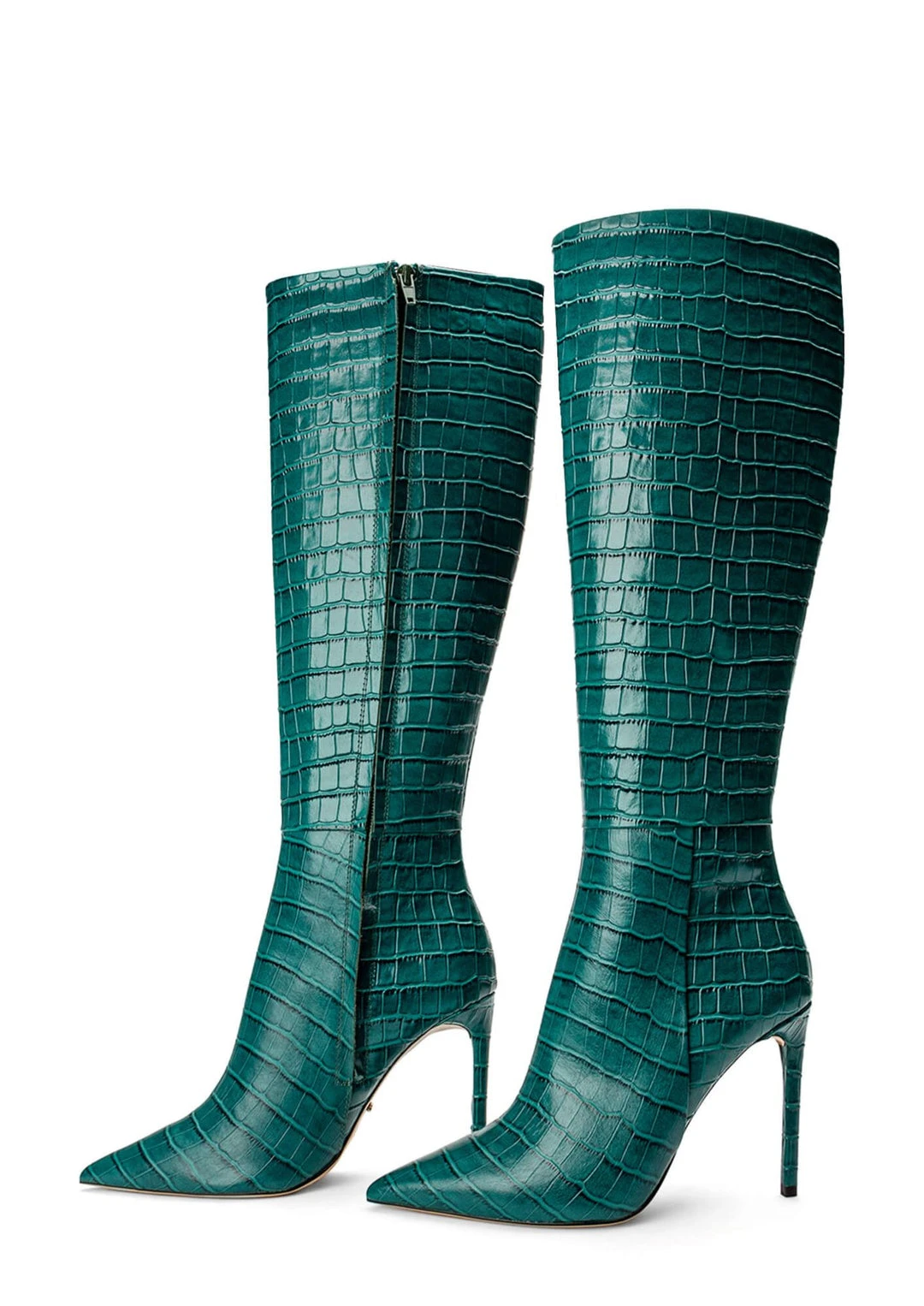 You can’t go wrong with a knee high boot for winter! Our Apollo knee high boot features a forest green hue with classic croc print detailing, a slender shape with a pointed toe design, a high stiletto heel and a full length zip for an easy wear.