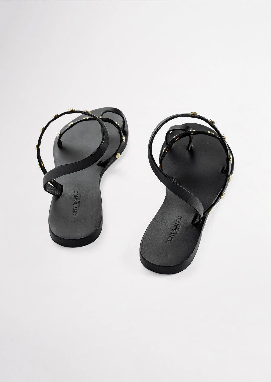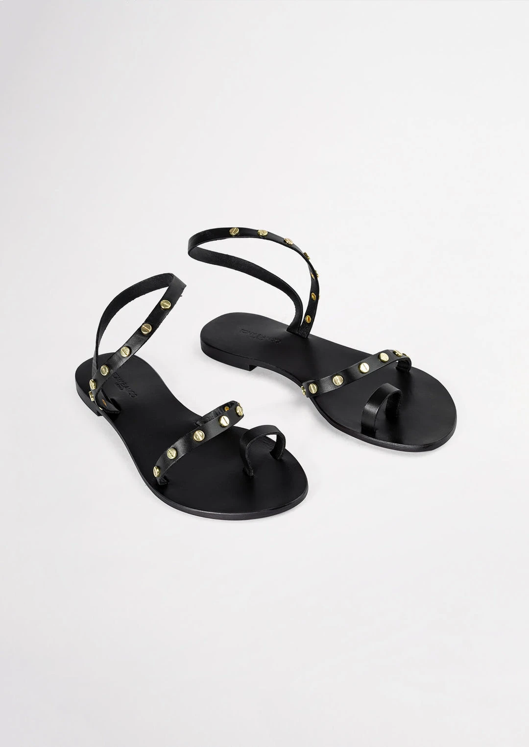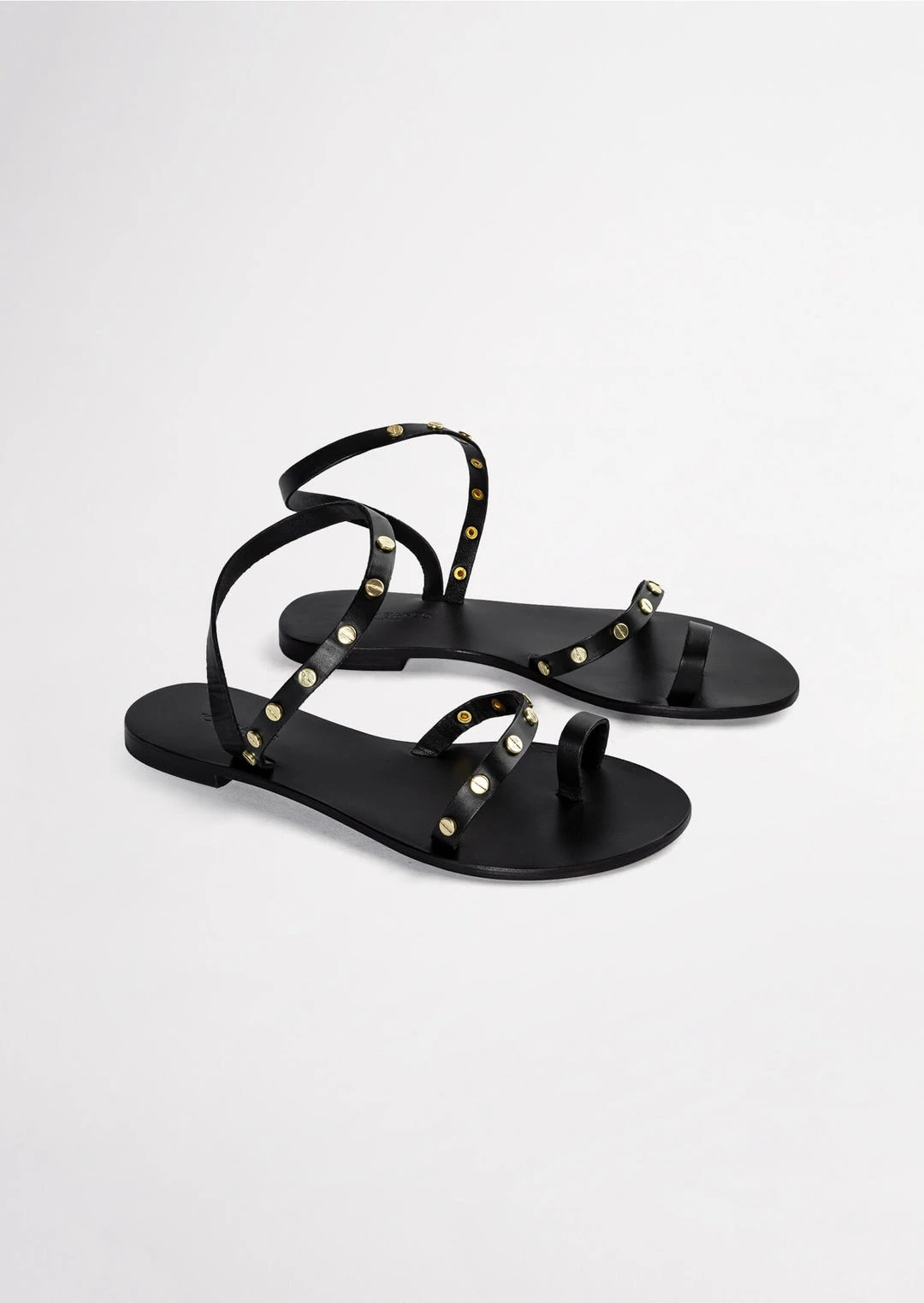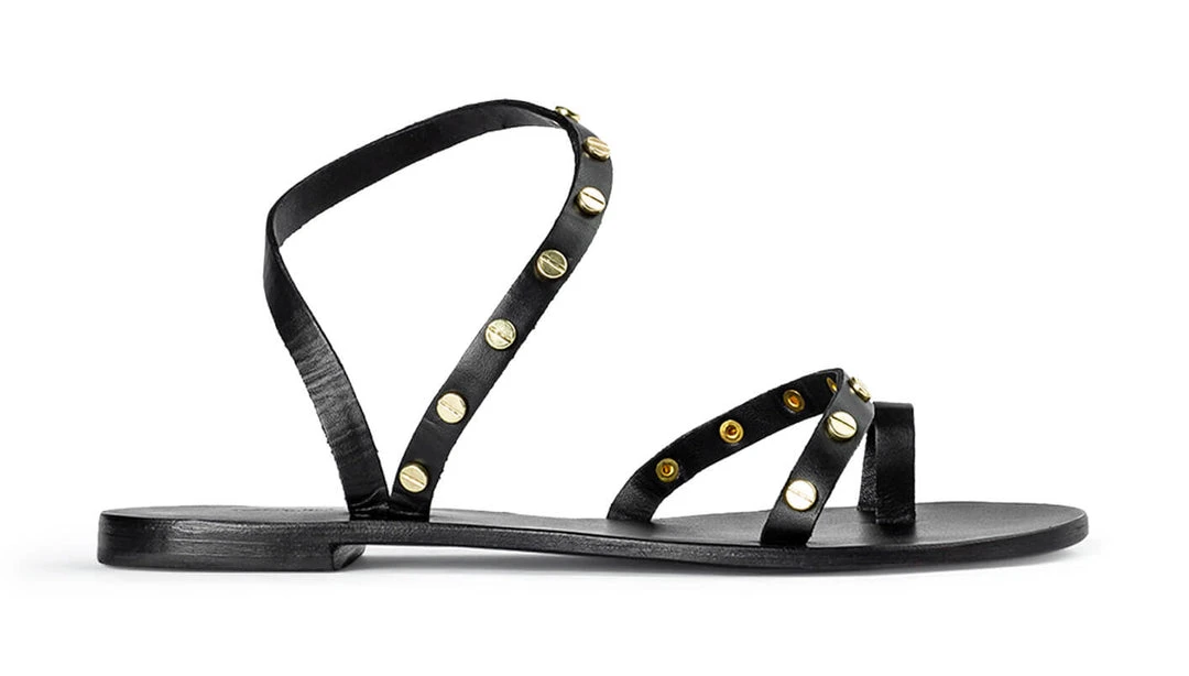 A black leather sandal with a toe ring, strap across the strap and ankle halter with gold-toned hardware.