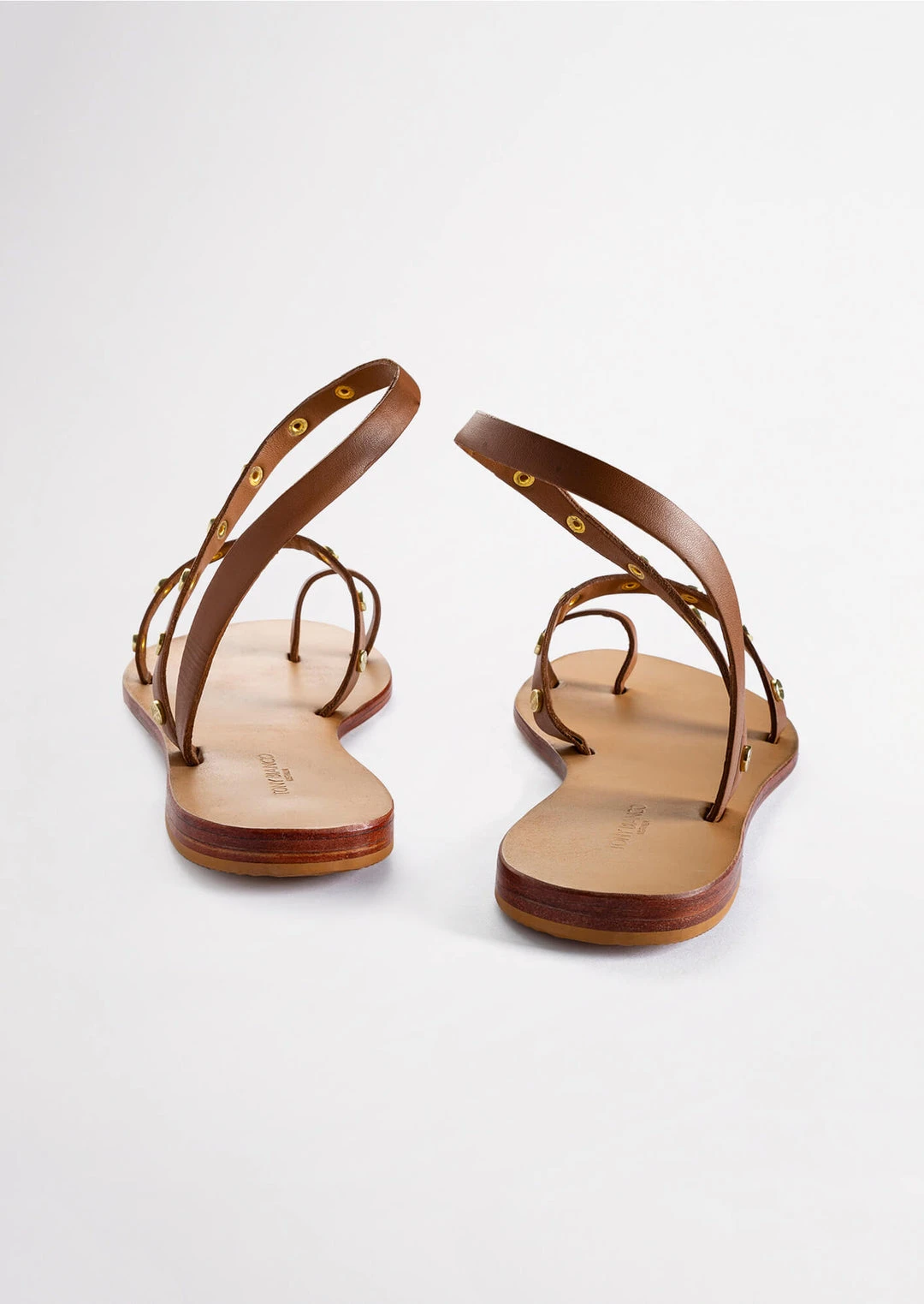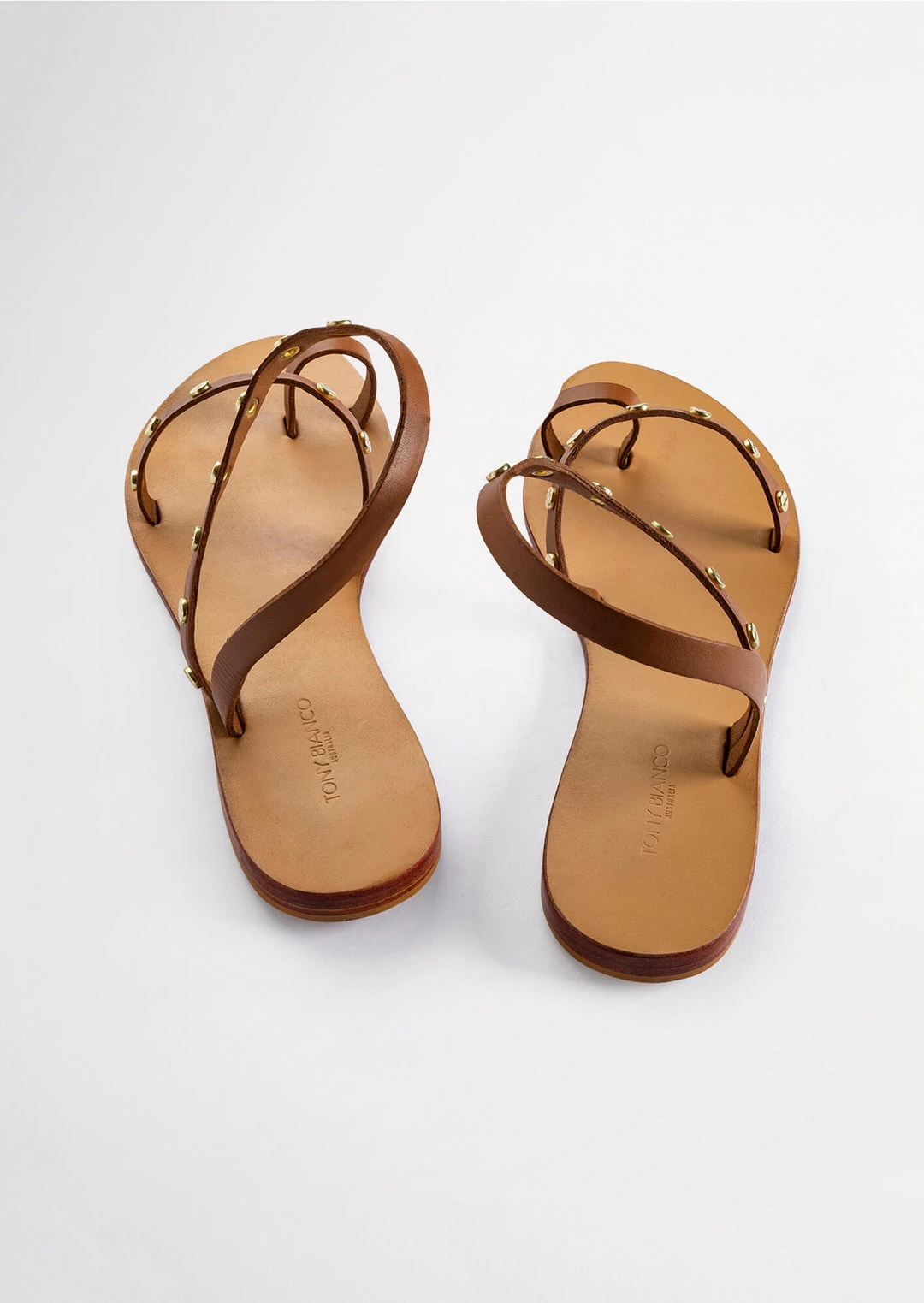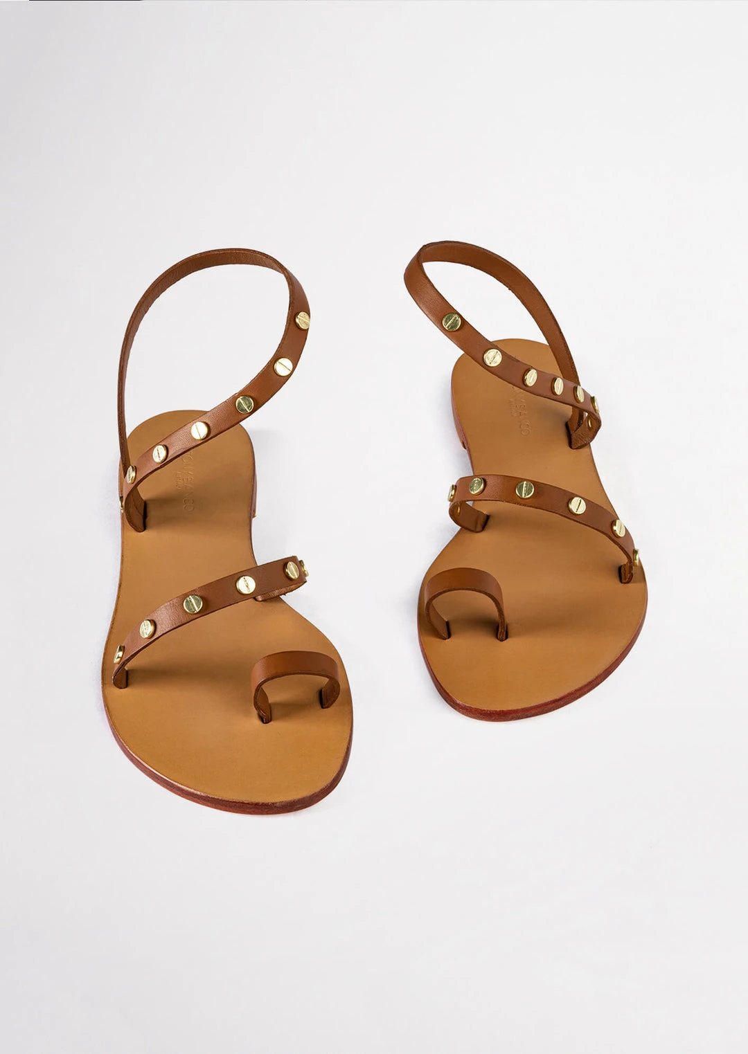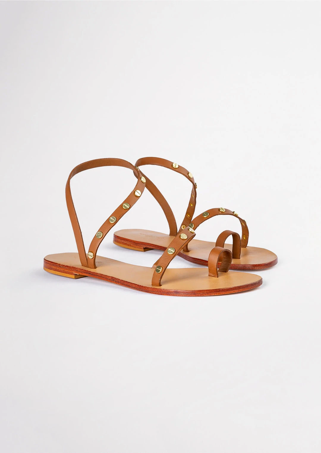 A tan leather sandal with a toe ring, strap across the strap and ankle halter with gold-toned hardware.