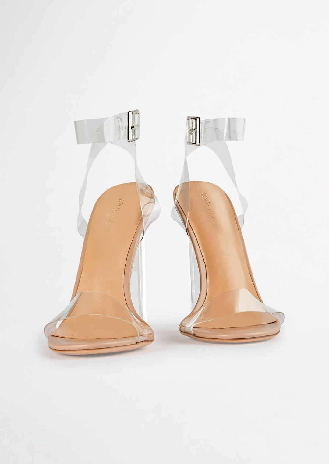 Introducing the oh-so-stunning Kiki heels. Boasting a transparent vinylite ankle strap and upper, paired with an iconic acrylic heel, be prepared to take your look to the next level with this modern design.