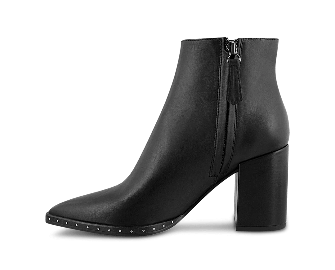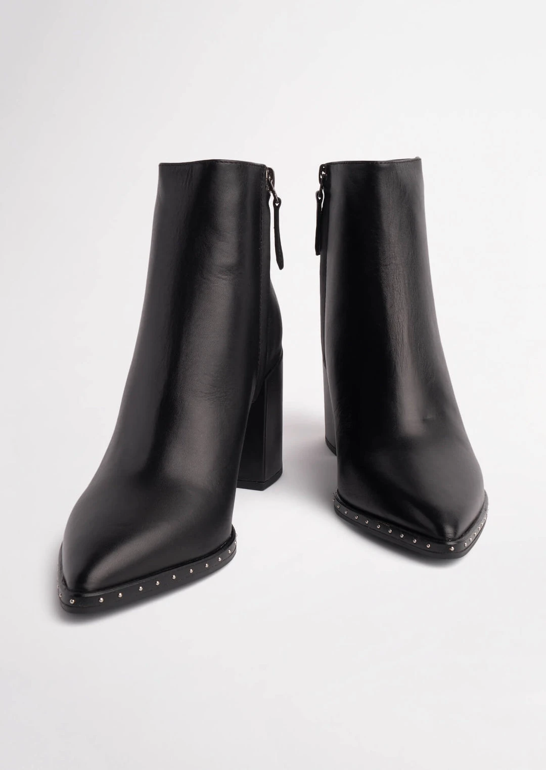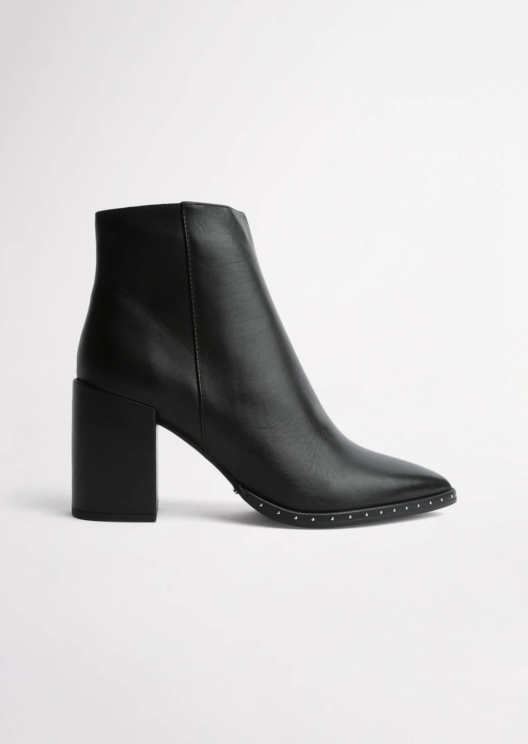 Easy to love and style, the ever-chic Bailey boot will soon become an everyday favourite. Showcasing a pointed toe highlighted by silver studded hardware this boot features a leather covered 8.5cm heel and inside zip.