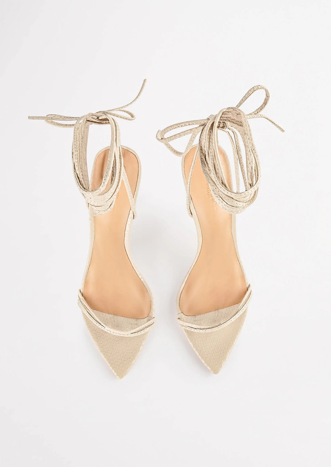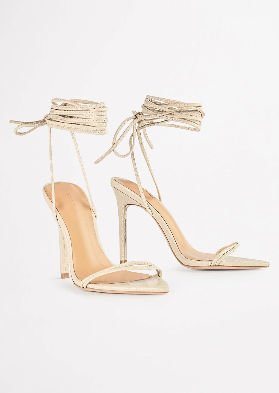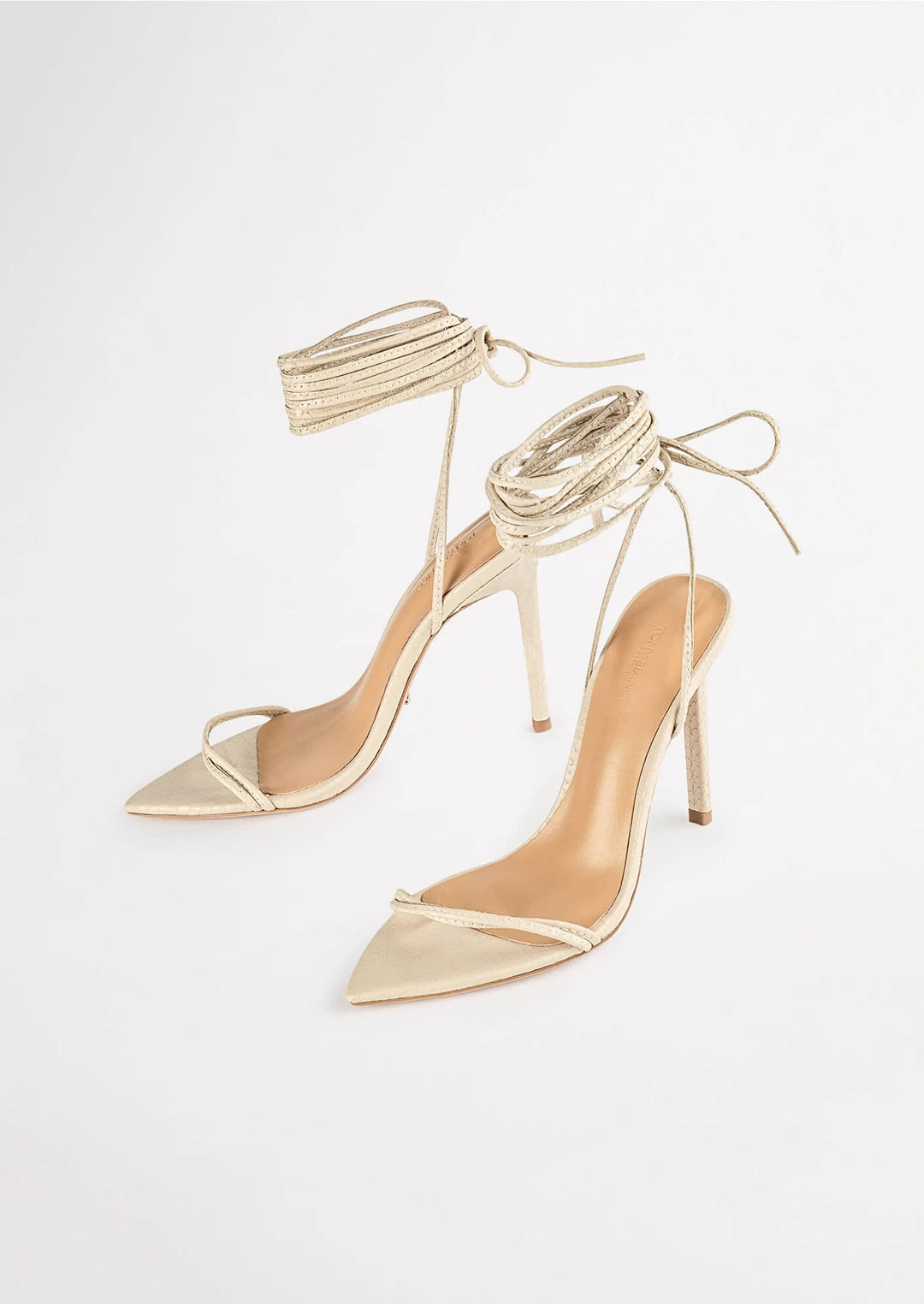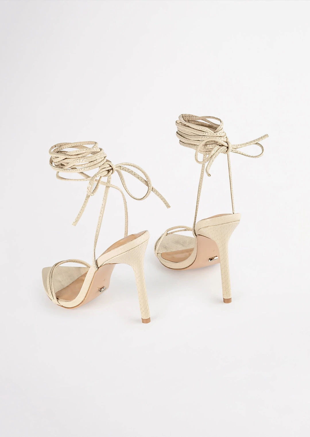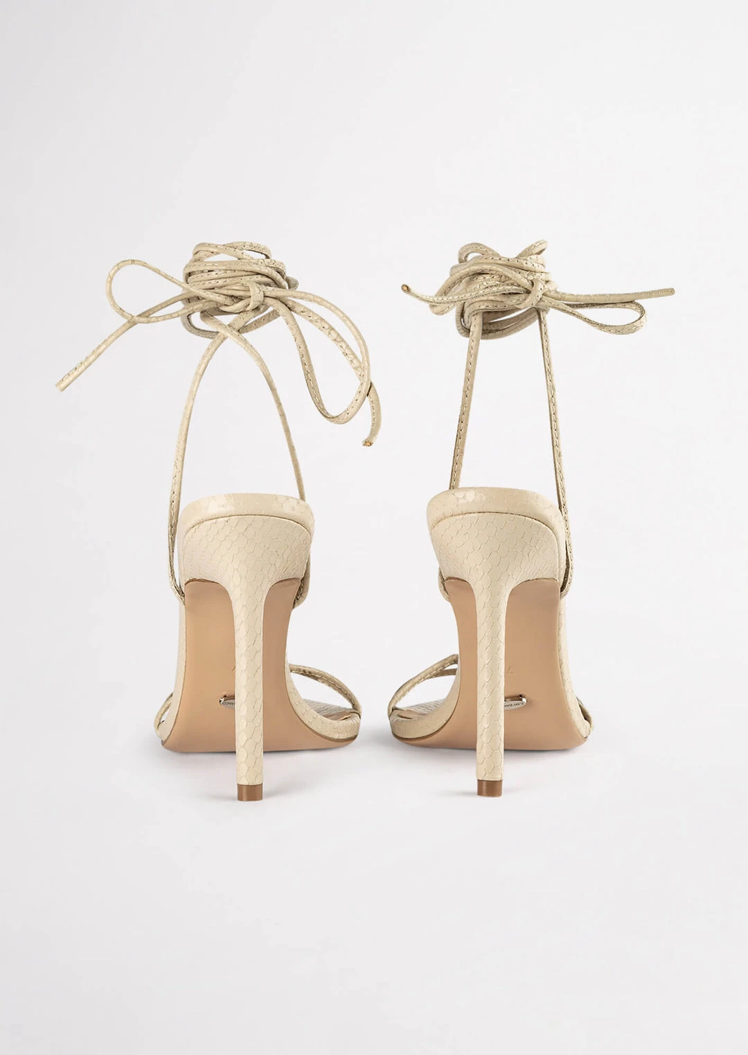 Set yourself up for some vibes with our Millie lace-up strappy heels in vanilla snake. Showcasing slender straps across the foot and a wrap-around ankle design, this style features a pointed toe-shape and a thin stiletto heel and is finished with a leather upper and quality leather lining.