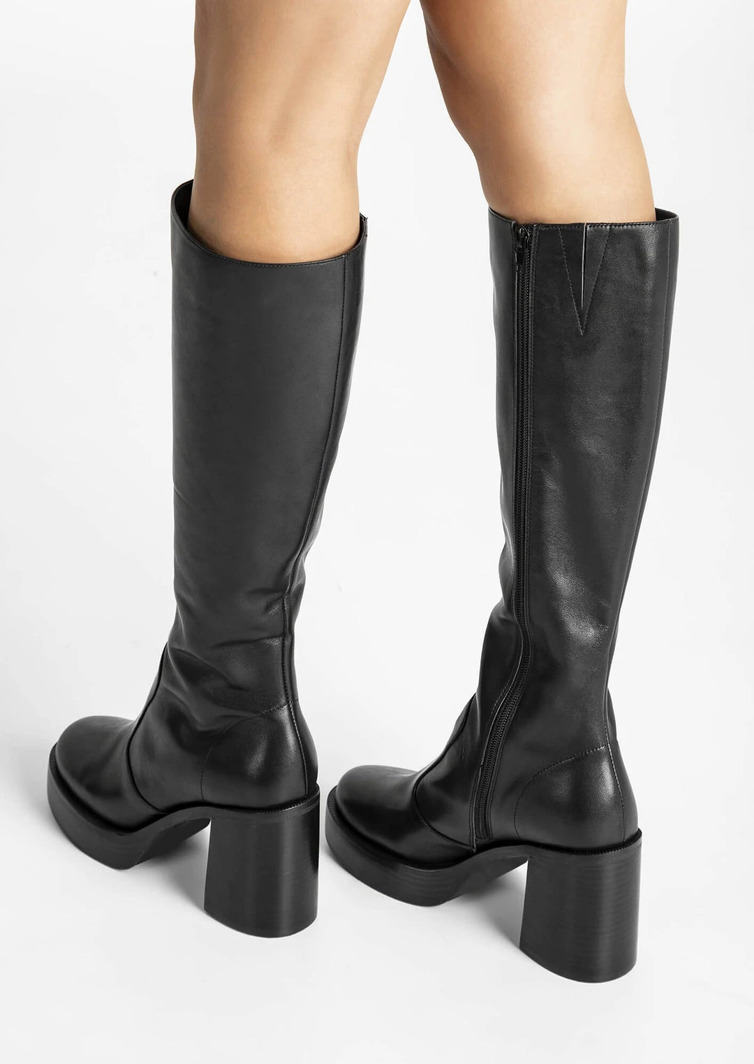 Showcasing a stand-out squared toe and an ultimately chunky sole and heel, the Toni knee-high boot will make a statement this season. Made with a leather upper, lining and cushioned sole and finished off with a truly 90’s aesthetic.
