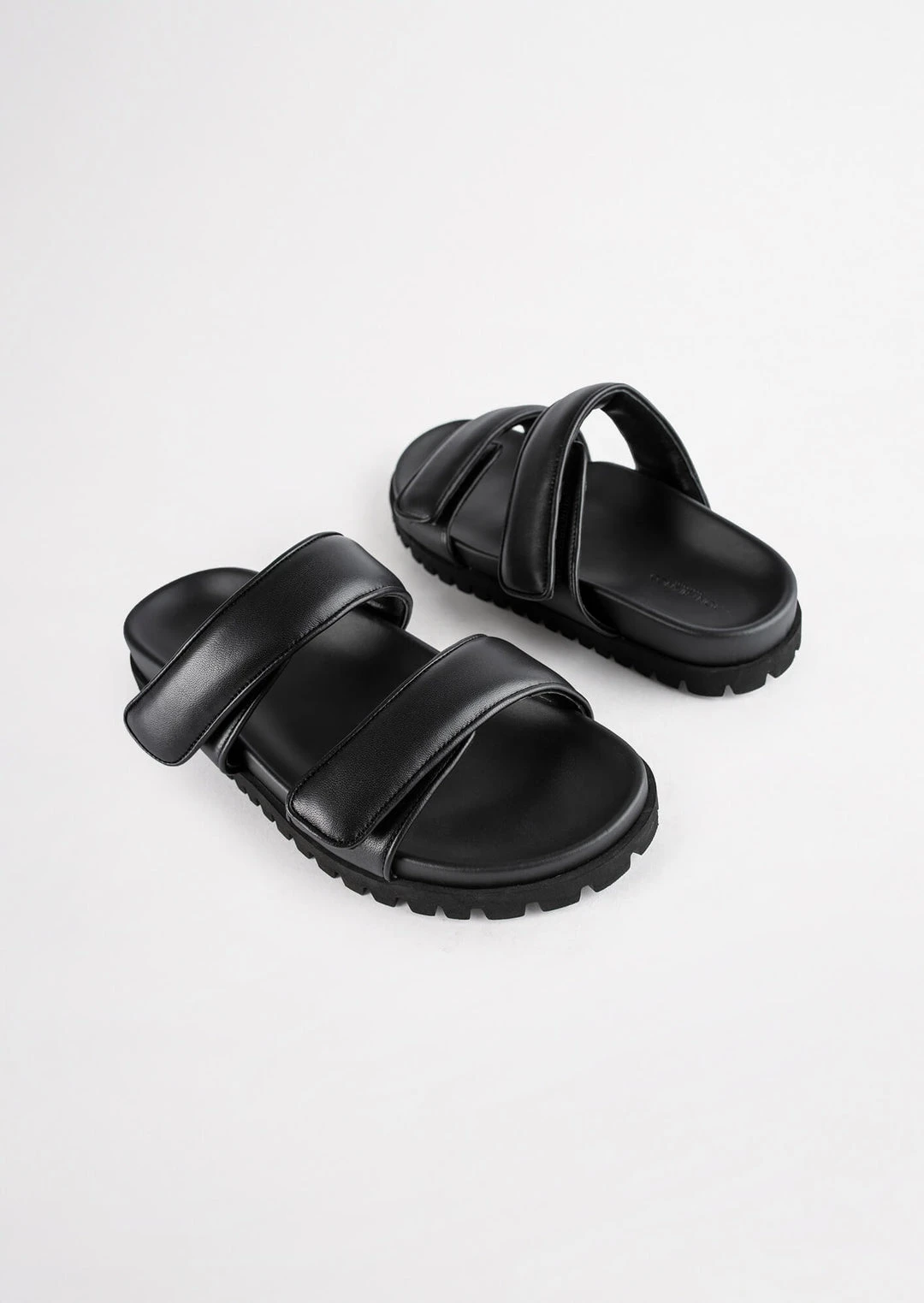 The Bonny slides in genuine black leather are a winning combination of fashion-forward and comfortable. Featuring soft padded leather velcro straps sitting on top of an elevated platform foot bed. You can thank us later.