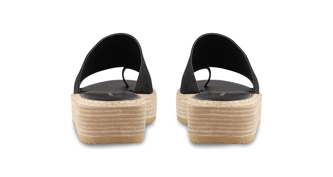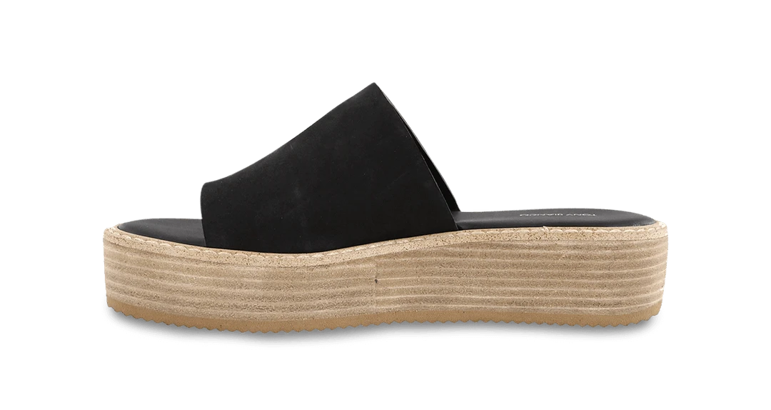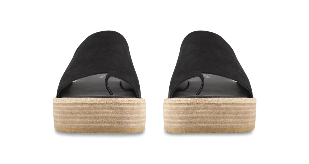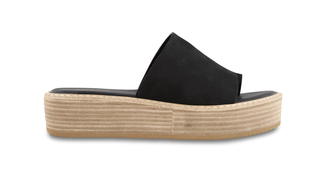 A black nubuck slip on sandal with a ring peeptoe, a wooden flatform and a white cleated sole. Leather upper and synthetic lining. Heel height is 4.5cm.