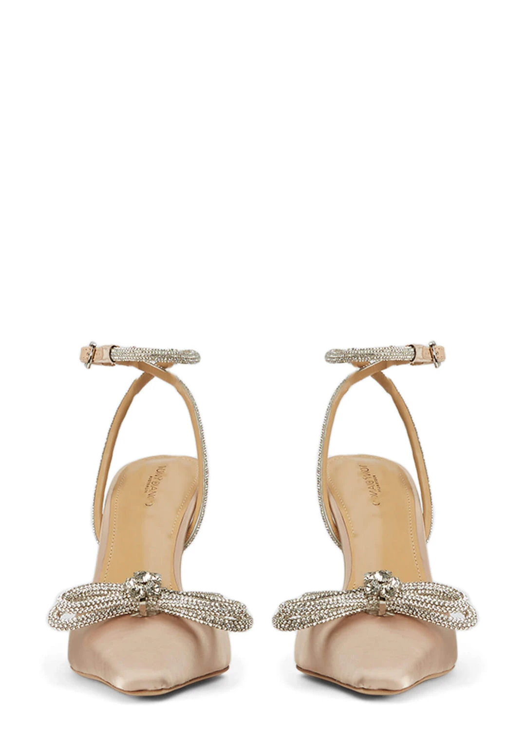 Let bling be a forever thing with our newest stiletto star Eros. Donning a glamorous nude satin finish with luxurious leather lining, this pointed-toe heel paired with an embellished sling-back strap, evokes timeless elegance.