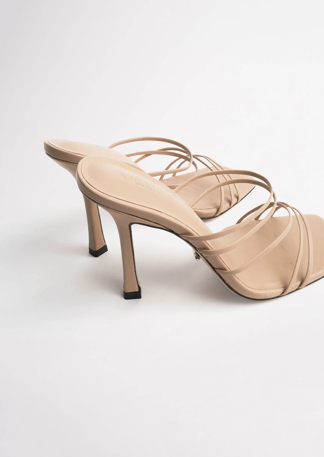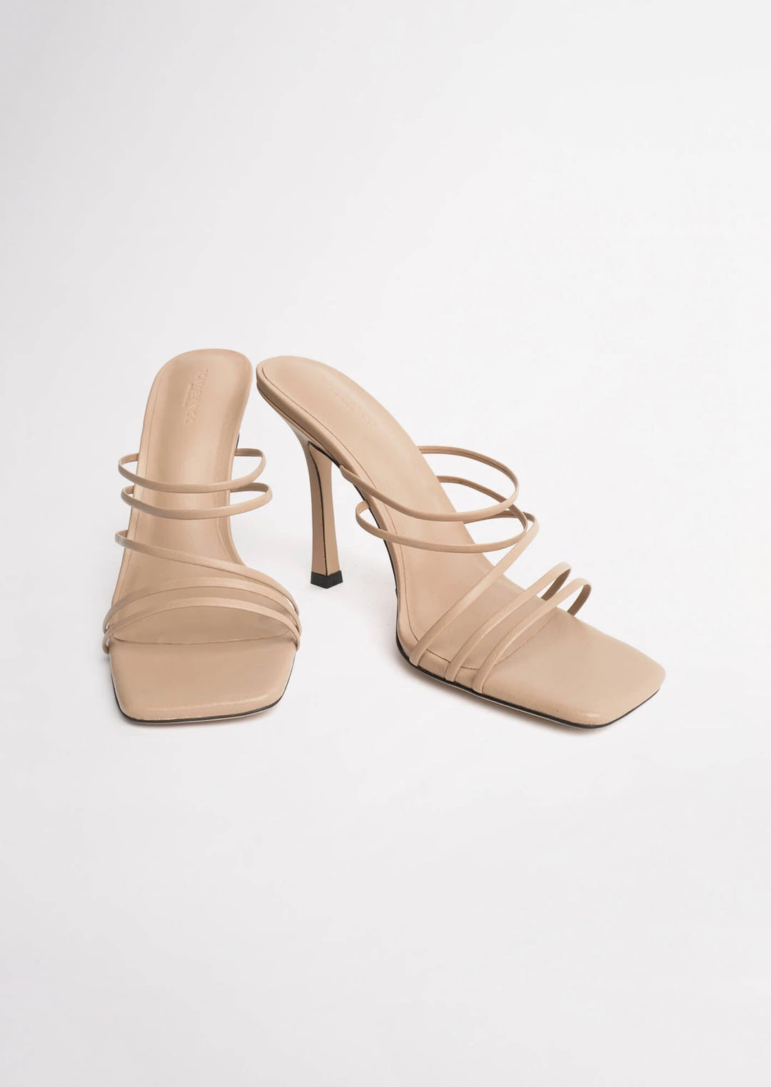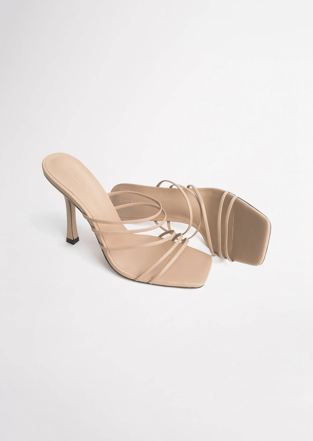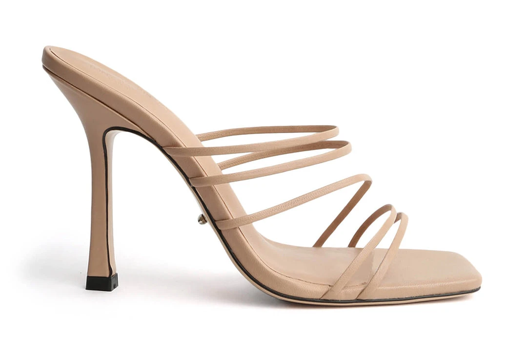 Dress to impress with the Foxie mules. Designed with multiple slender cross-foot straps, this slip-on style features a striking squared toe-shape, a comfortably padded foot-bed and is set atop a 10.5cm stiletto heel.