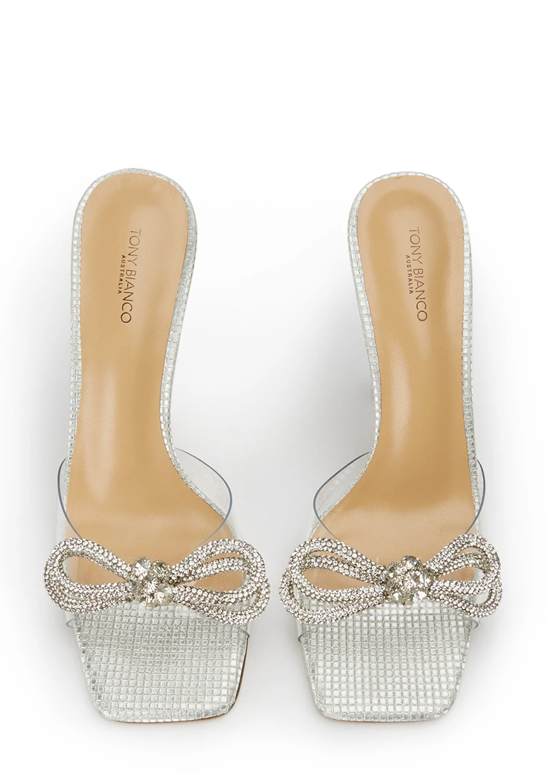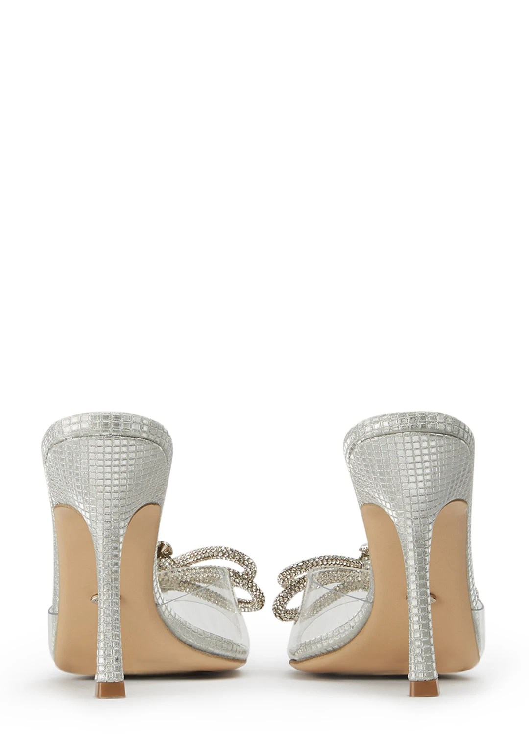 What’s better than a bow? Introducing Franki your next bling mule moment. Featuring a chic silver satin-like finish, timeless lower stiletto heel and open-toe silhouette. This forever piece is topped with a glamorous bling bow and vinylite upper, to keep things lux this season.