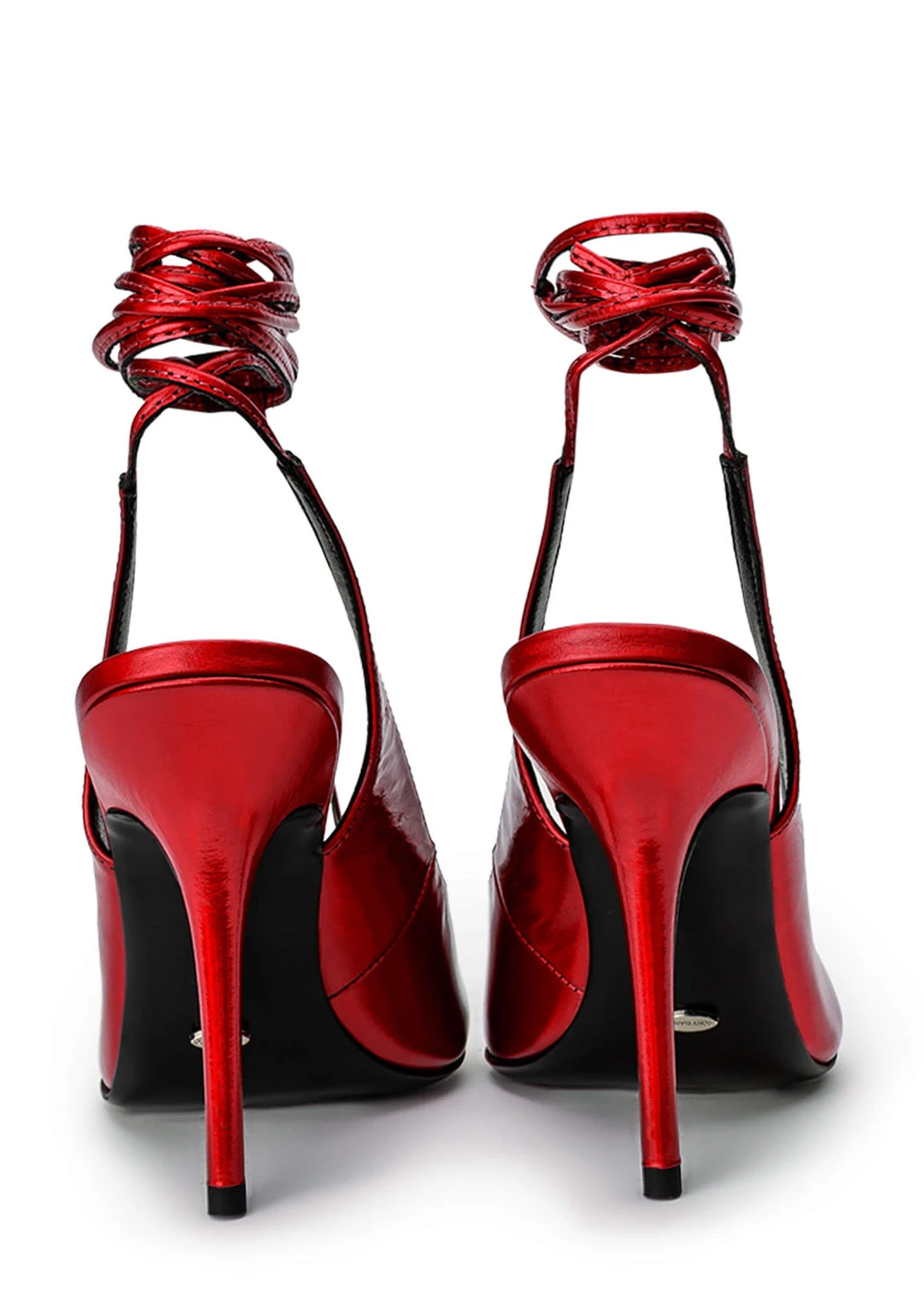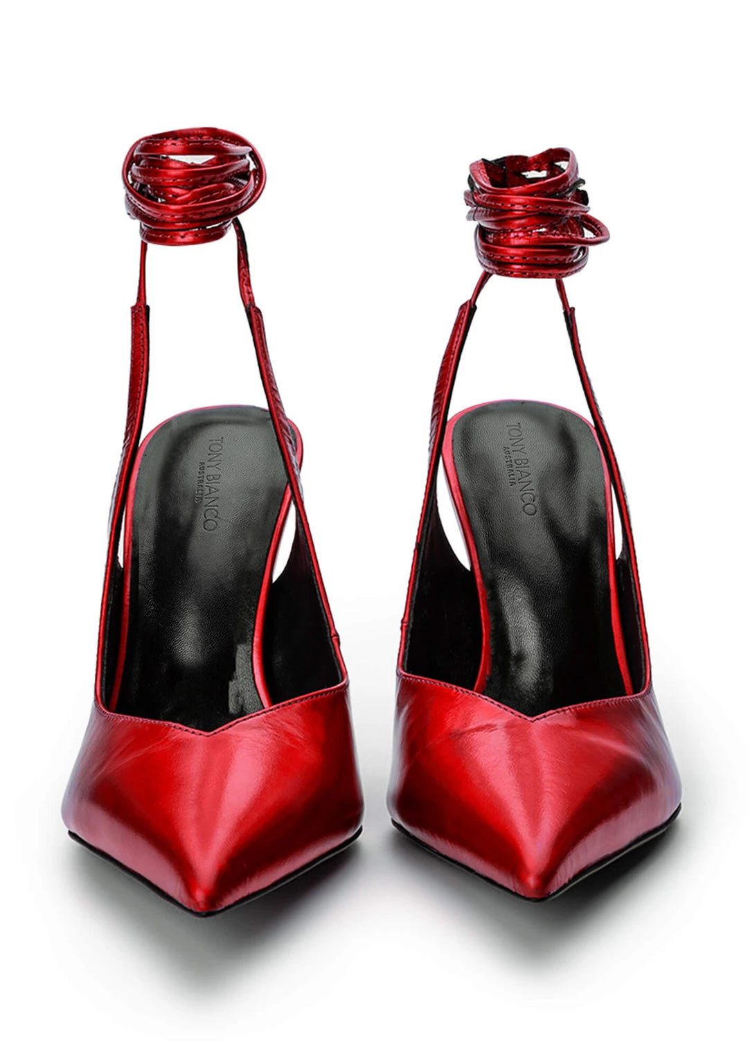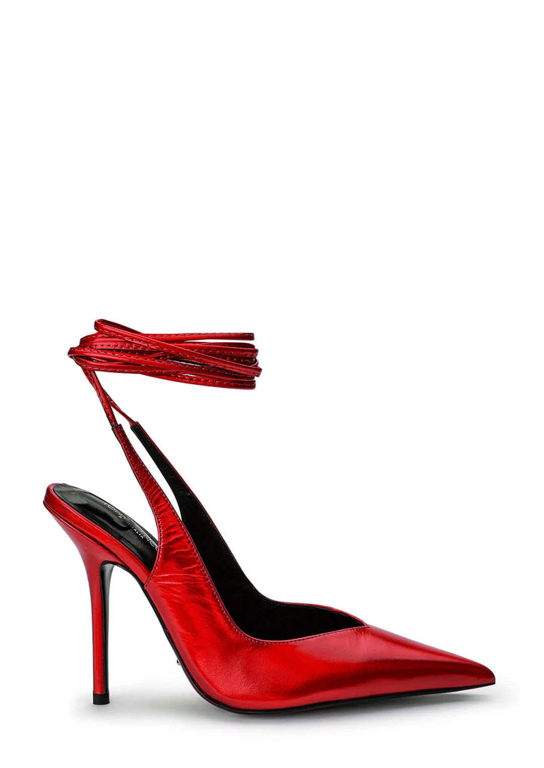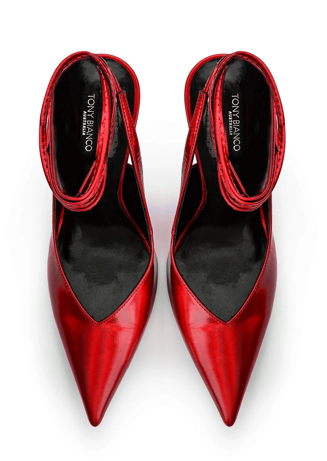 The Glint red stiletto heels are set to impress. Featuring a bold iridescent red leather, this high-shine number is designed with a sleek pointed toe pump, wrap-around ankle straps and a high stiletto heel.