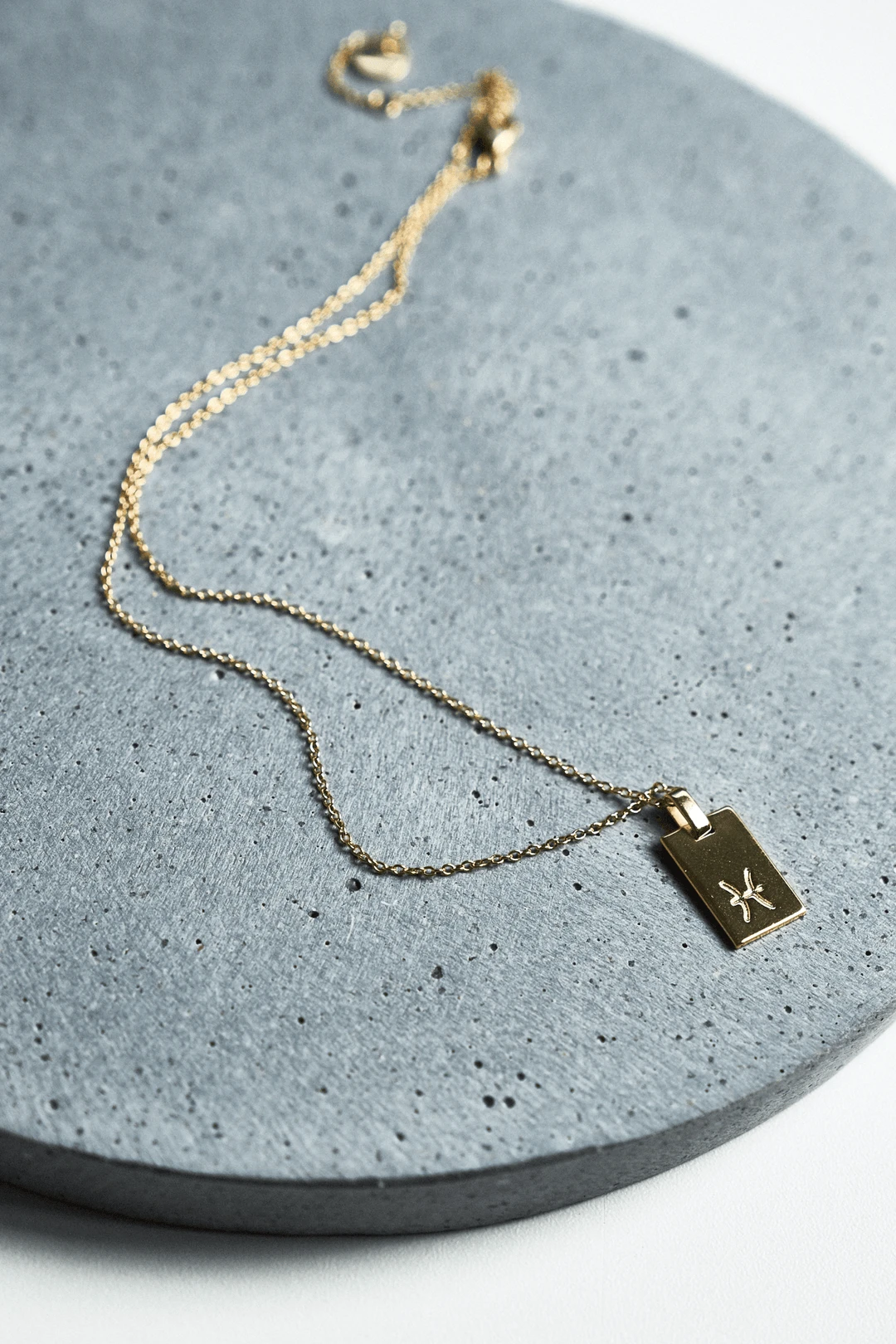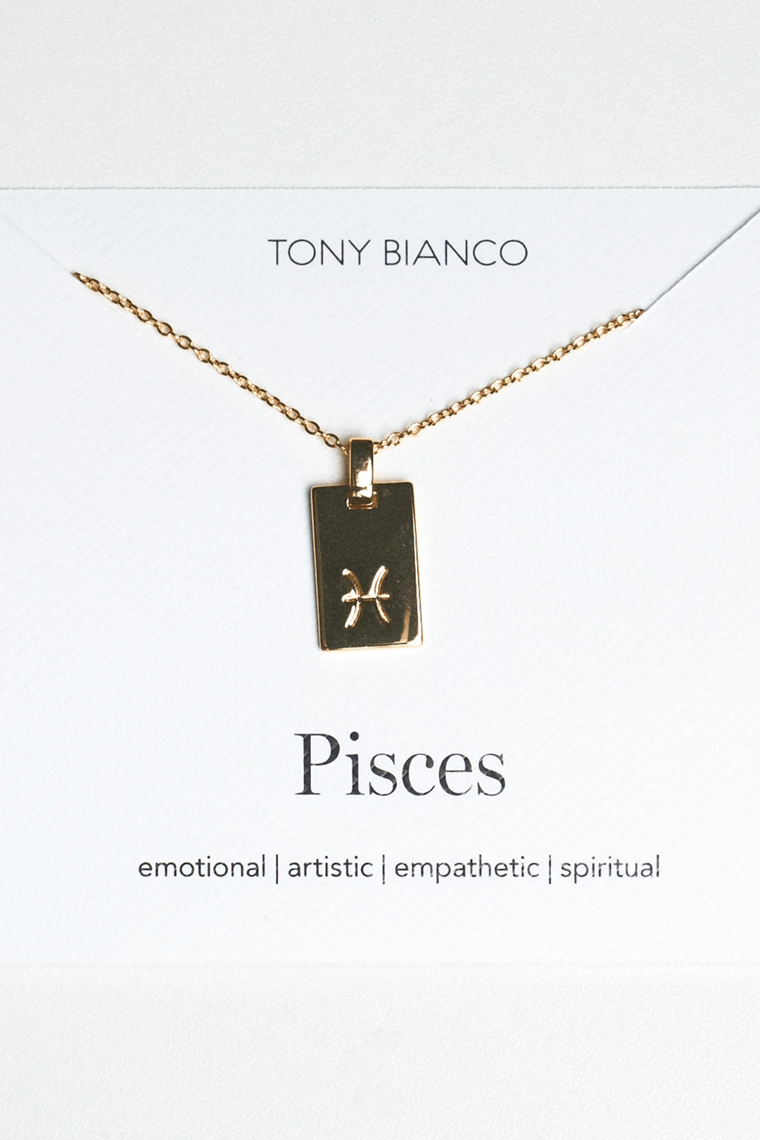 The Pisces Zodiac Necklace features an engraved, rectangular gold pendant on a fine gold chain. Can be worn solo or layered under other fine gold pieces.