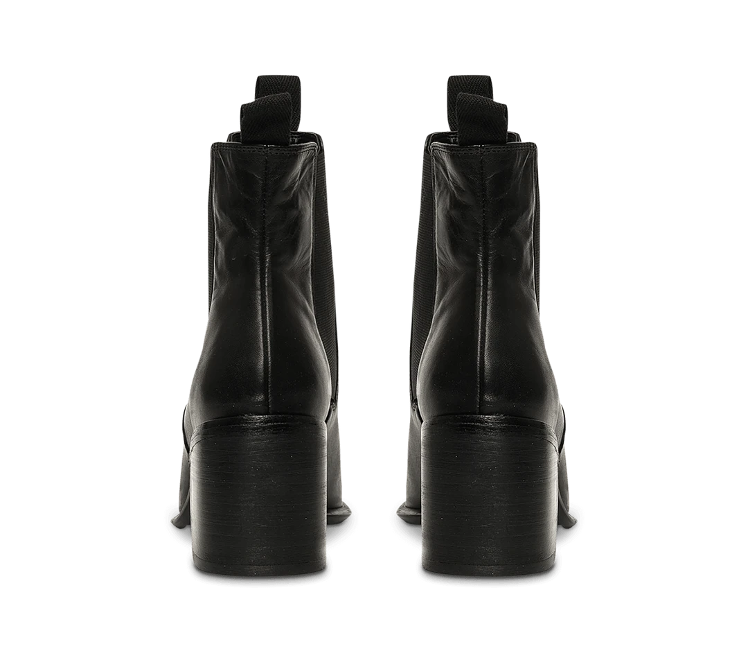 A black leather ankle boot with an almond toe shape, side gussets and mid block heel.