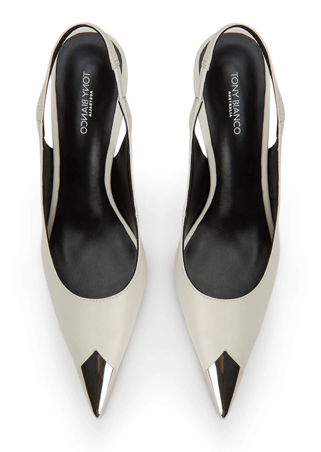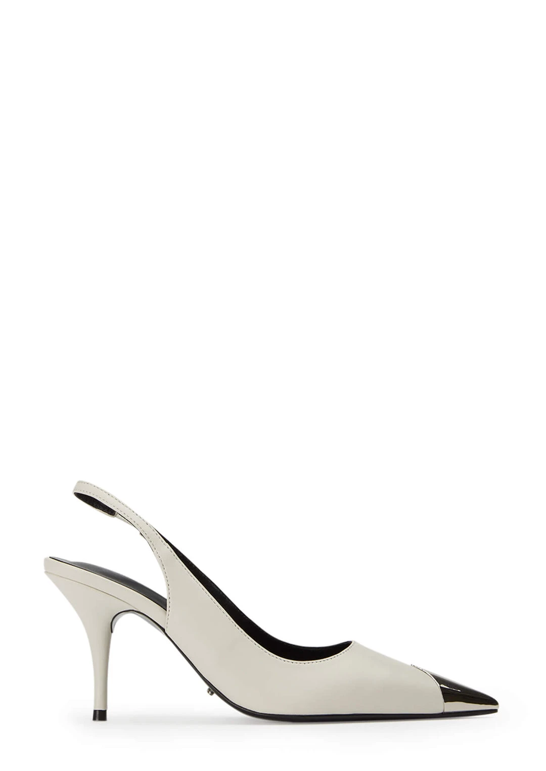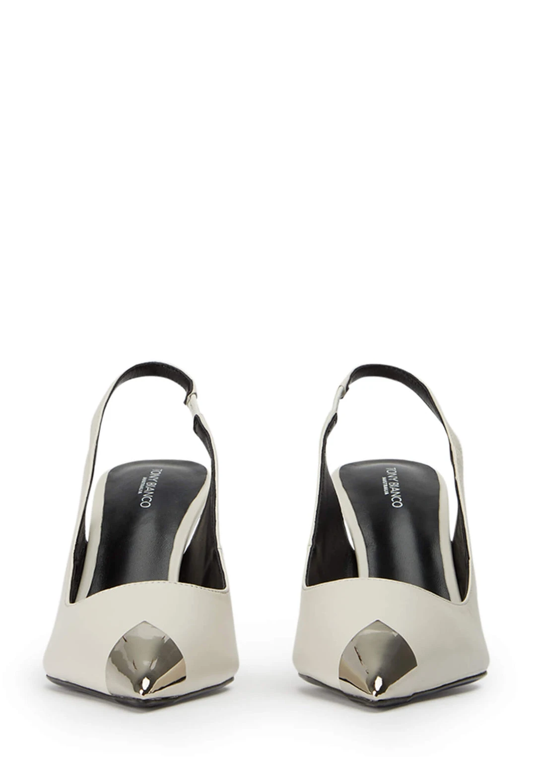 It’s straight to the point with Hope our new classic sling-back white pump. Showcasing an elasticated leather strap, lower kitten heel and edgy metal capped toe, she’s ready to complete your collection.