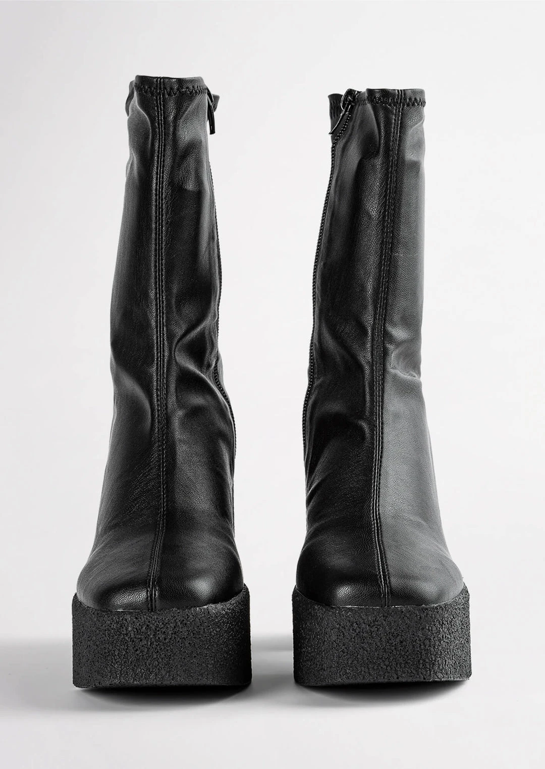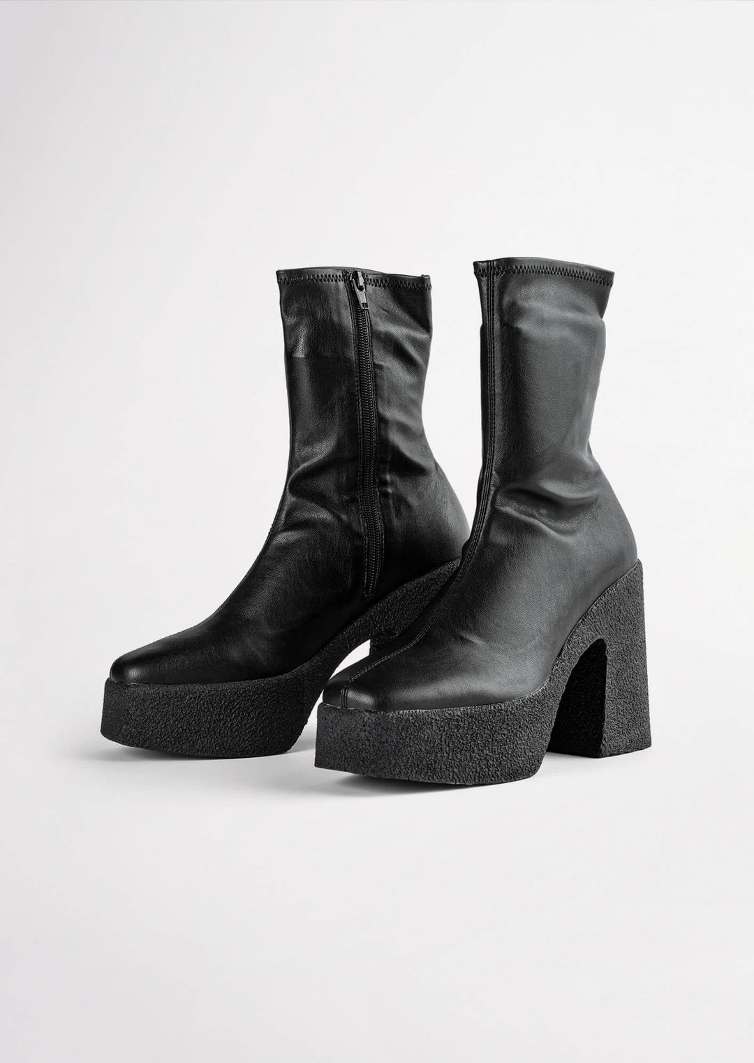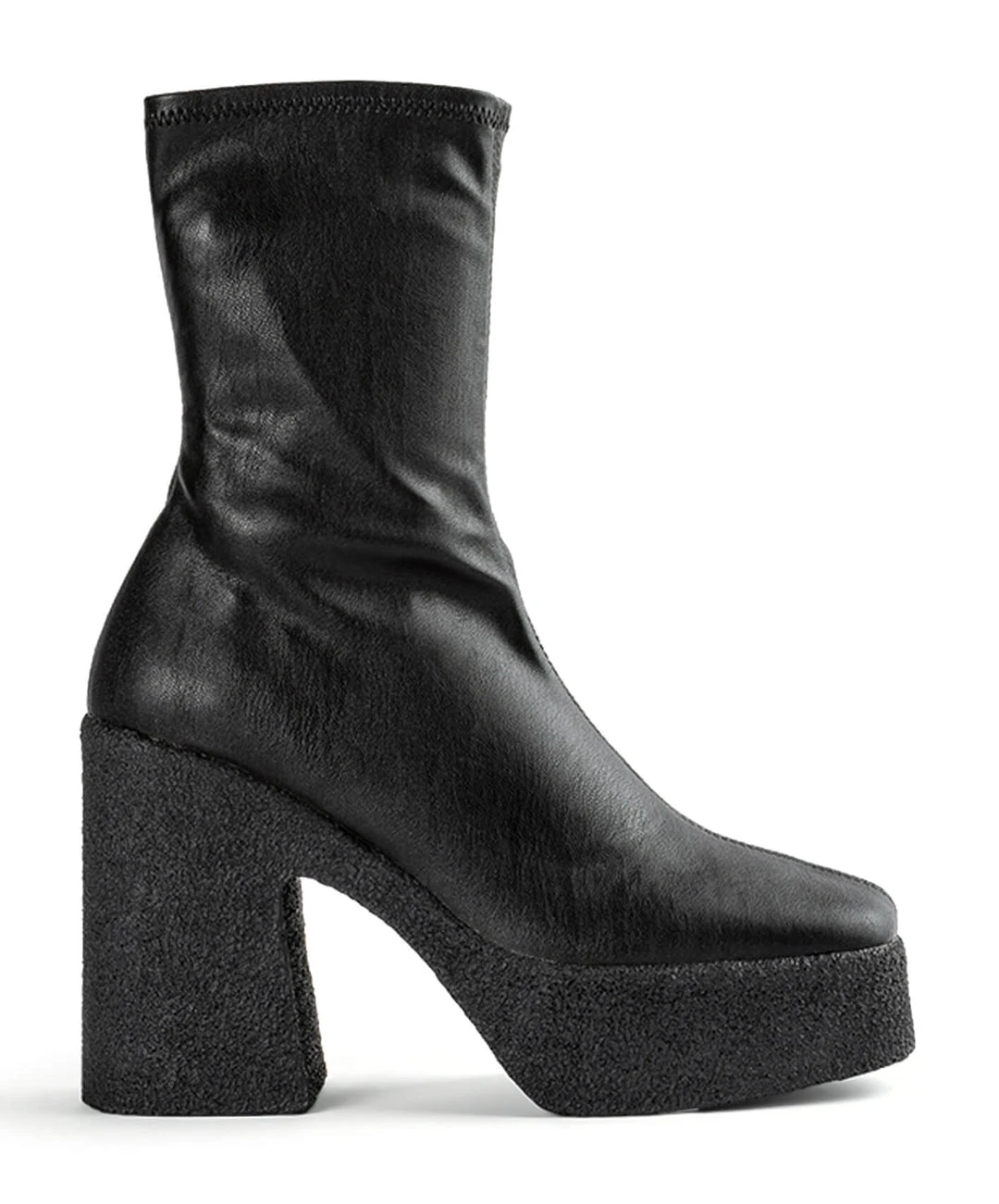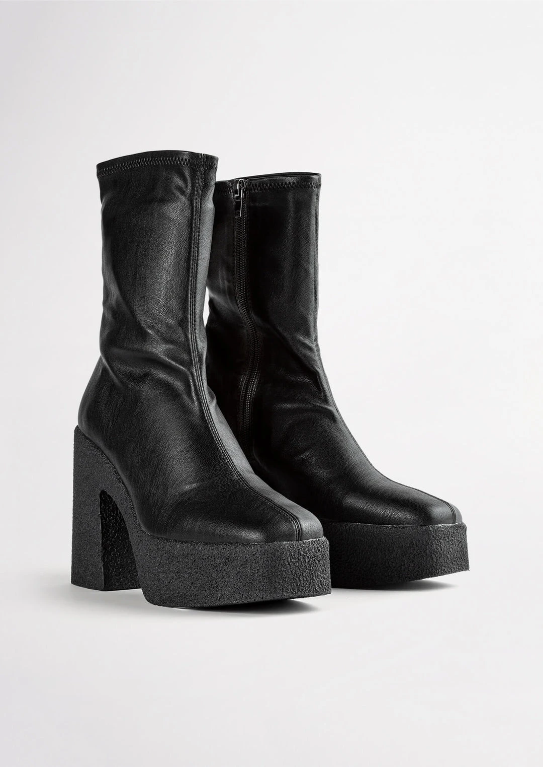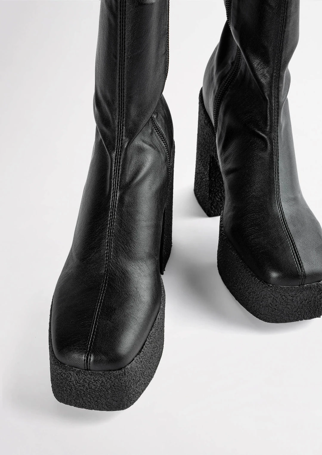 Elevate your style with the Jude boot in black venezia today. Designed with a sock-like fit, the Jude features a leather-look exterior with an exposed black side zip to the inner ankle and is set upon a platformed chunky sole with an 11.5cm heel.