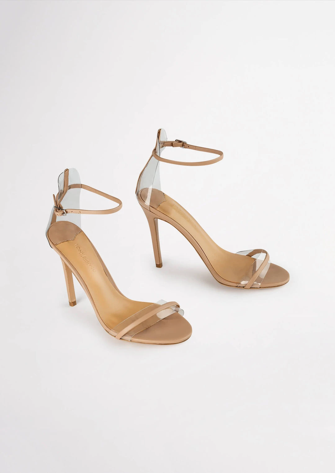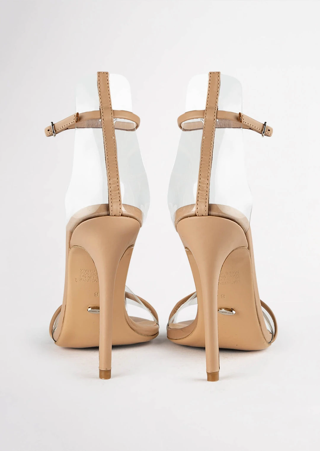 A skin leather open toe dress sandal with a stiletto heel with a leather and clear two strap upper.