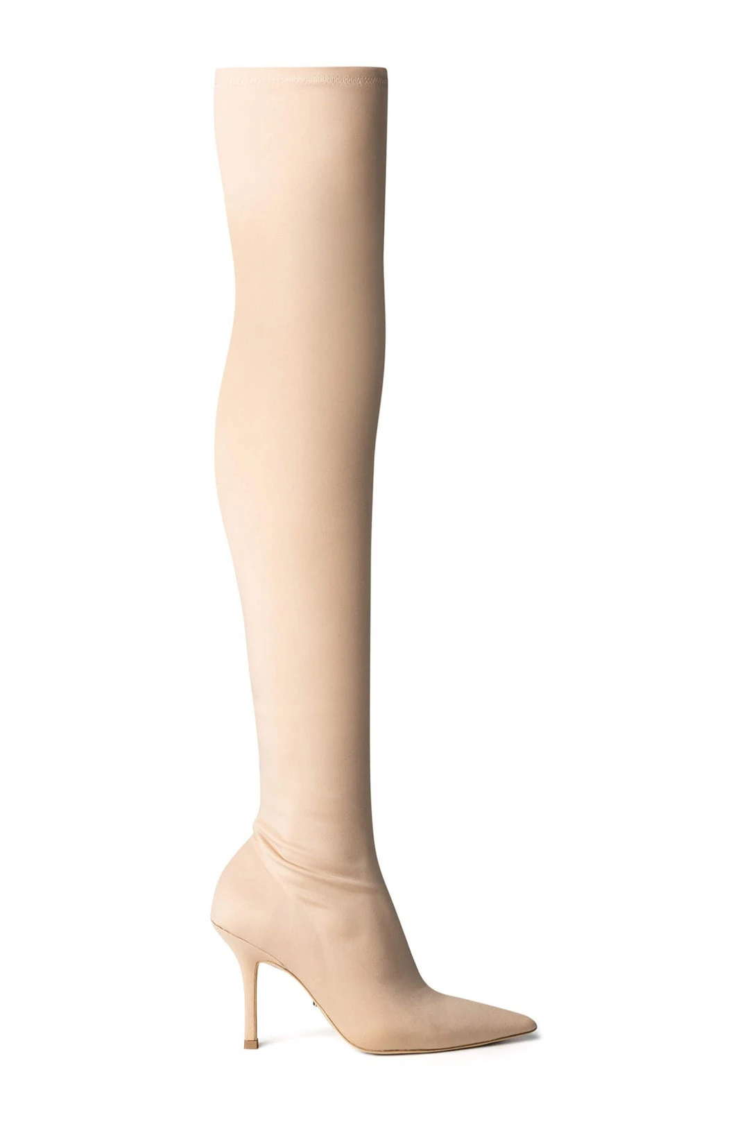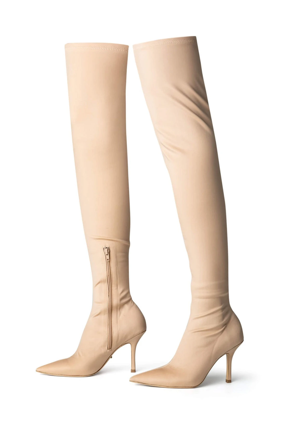 Don’t do subtle? No? Neither do we. Introducing our latest jaw-dropper, the Kylie thigh high stiletto boot. Bold by nature, this over the knee boot is made from a beige lycra fabrication and features centred seam stitching, a classic pointed toe and an inner zip to the ankle.