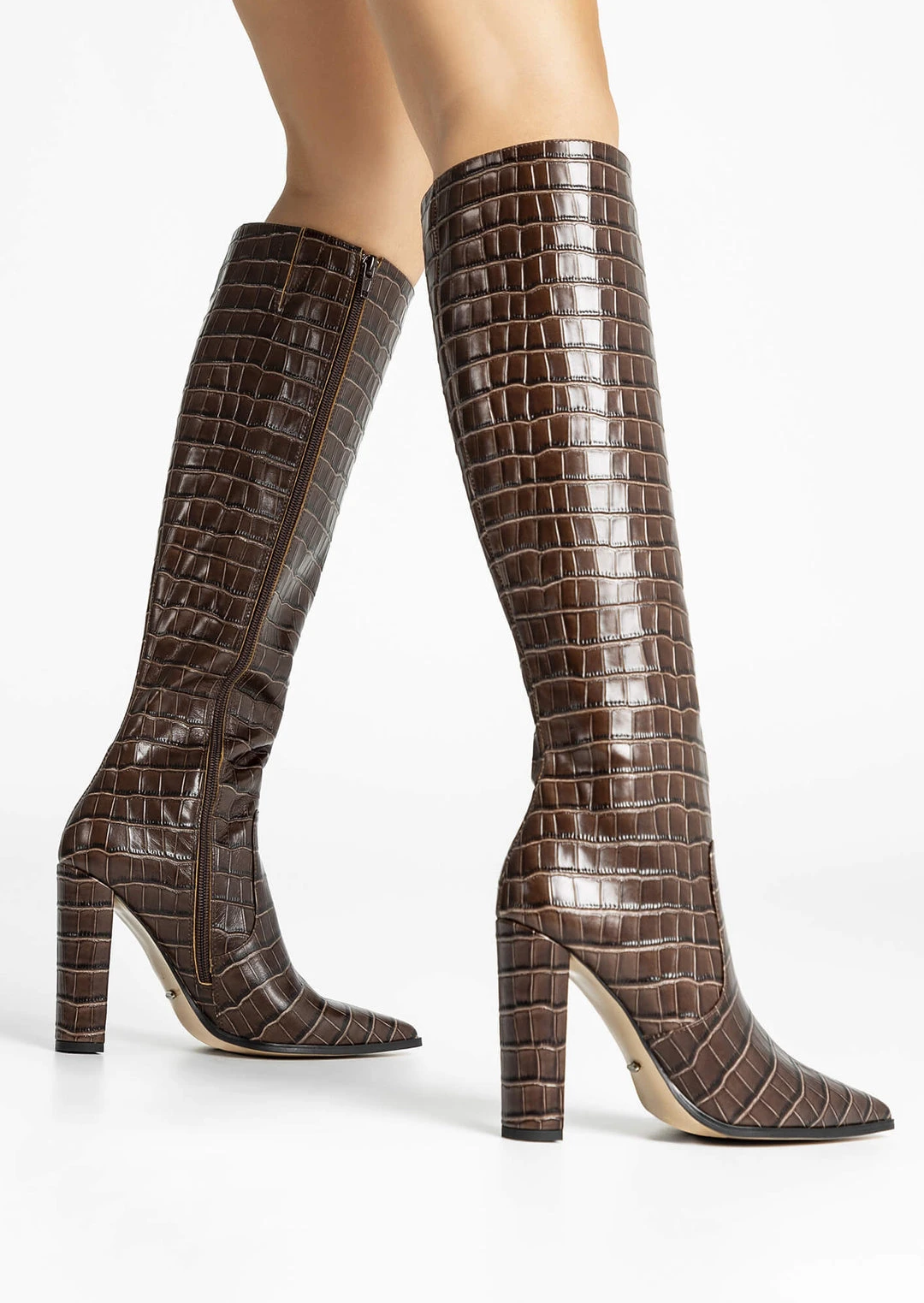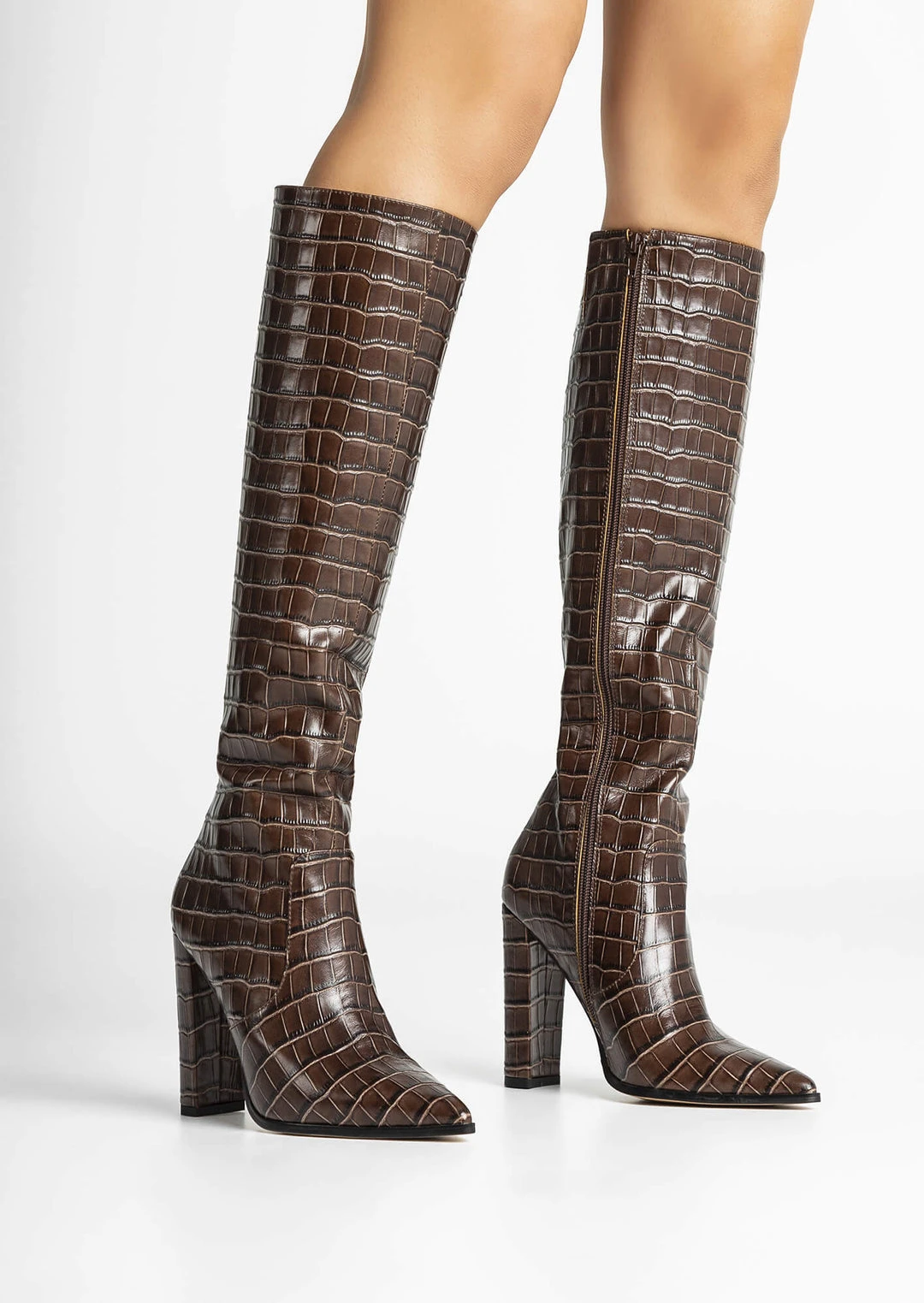 Get ready to fall in love with the subtle slouch of the Lucille boots. Crafted with a genuine brown croc printed leather this stylish knee-high boot features a pointed toe and pairs perfectly with midi dresses or skirts.
