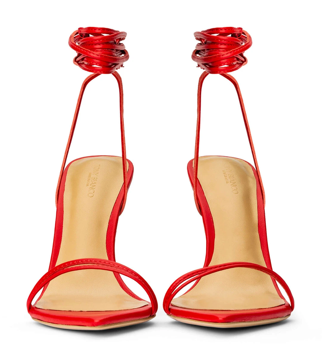 She’s here and she’s hot! Let us introduce the Millie lace-up strappy heels in Cherry Red. Showcasing slender straps across the foot and a wrap-around ankle design, this style features a pointed toe-shape and a thin stiletto heel and is finished with a leather upper and quality leather lining.