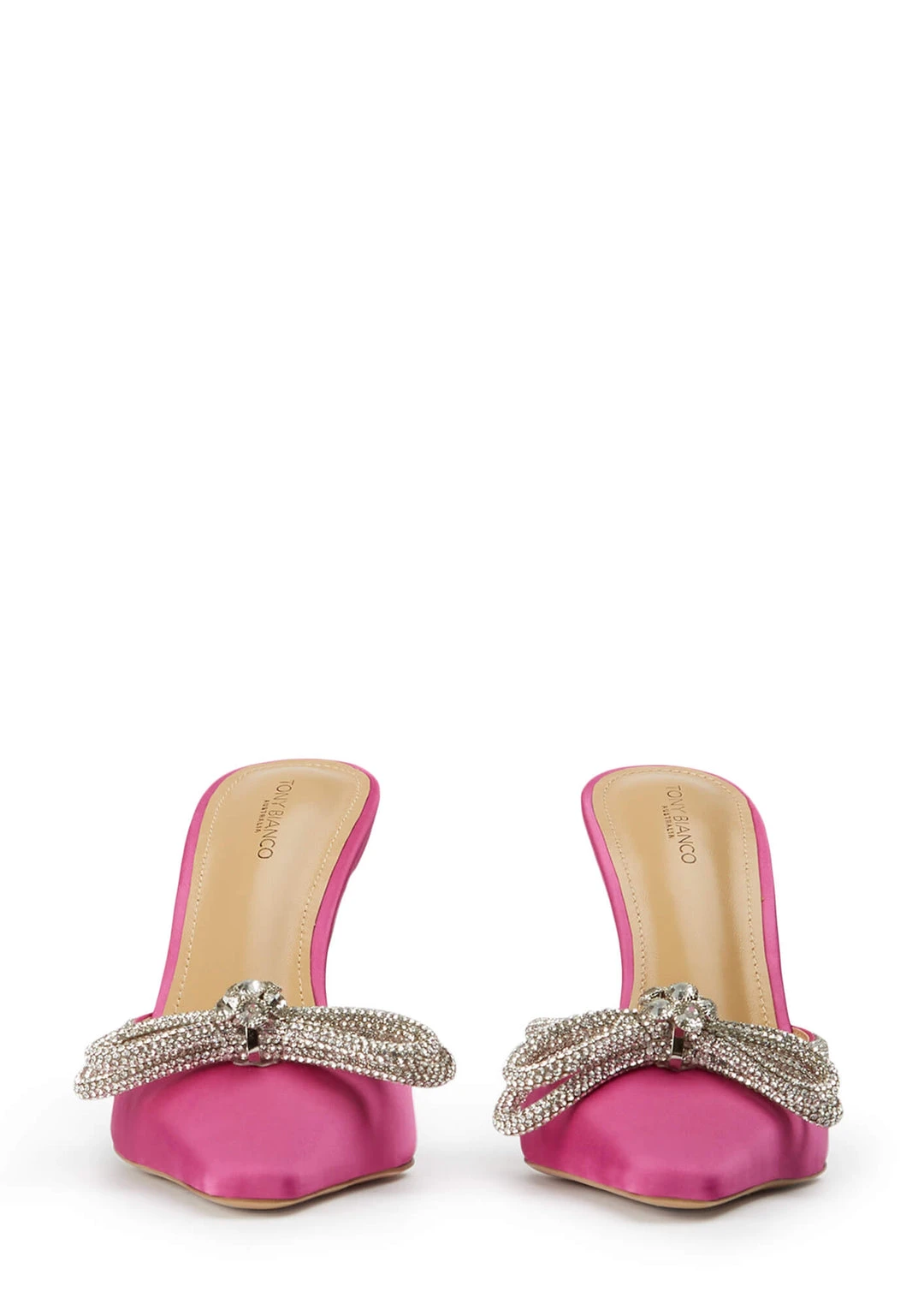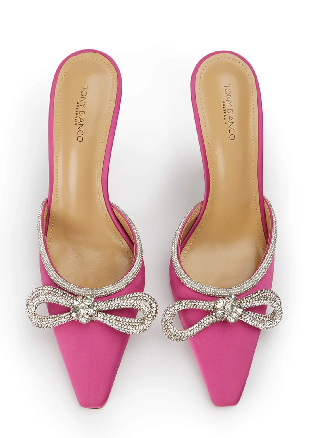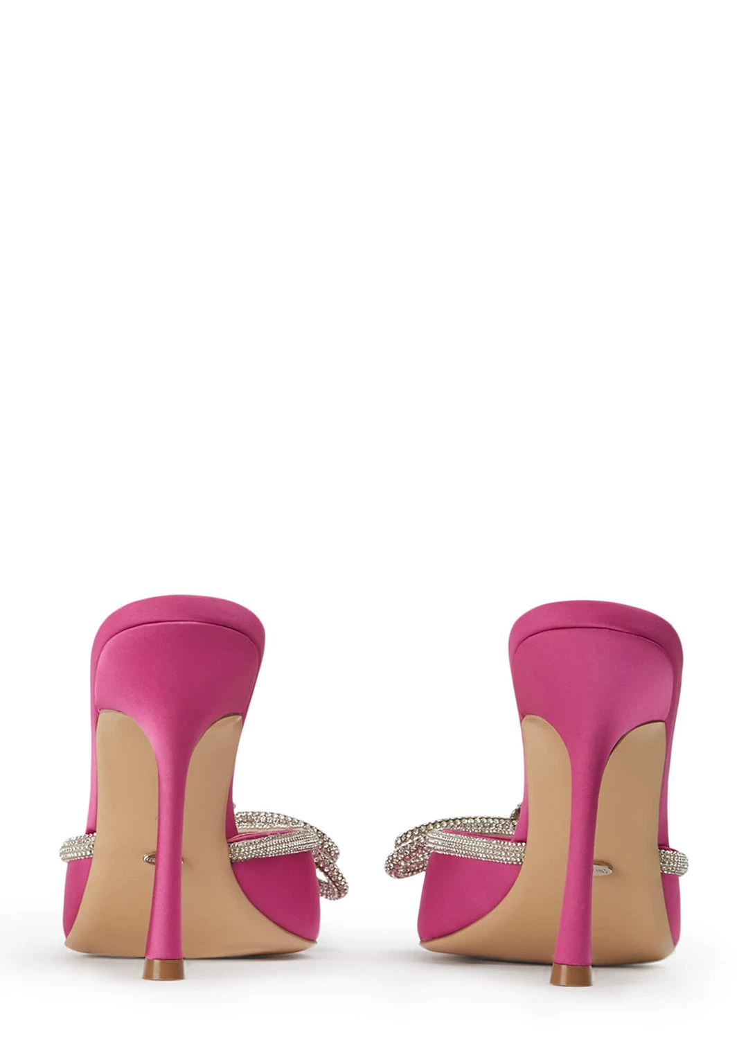 It’s meant to bling with the iconic Ellen pink satin heels. This eye-catching stiletto mule is adorned with a diamante bow detailing and elongated pointed-toe, providing effortless sophistication to any outfit.
