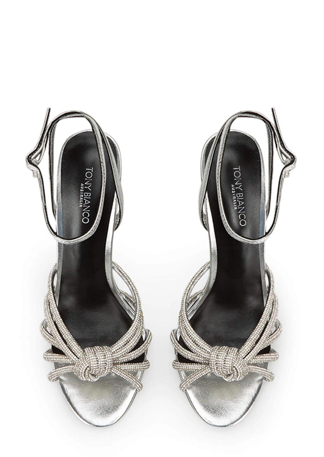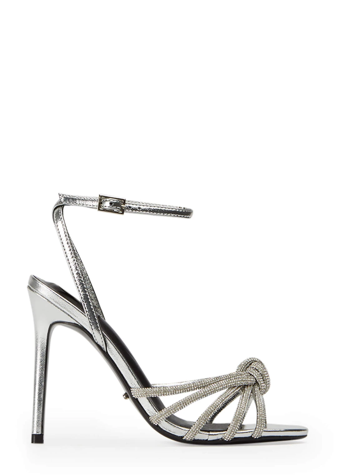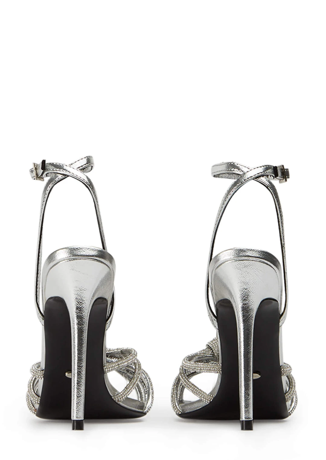 Tie the knot with the embellished Kyla silver metallic stiletto heels. With an interlocking diamante encrusted upper, stiletto heel and barely-there ankle strap, this can be your next bling fling.