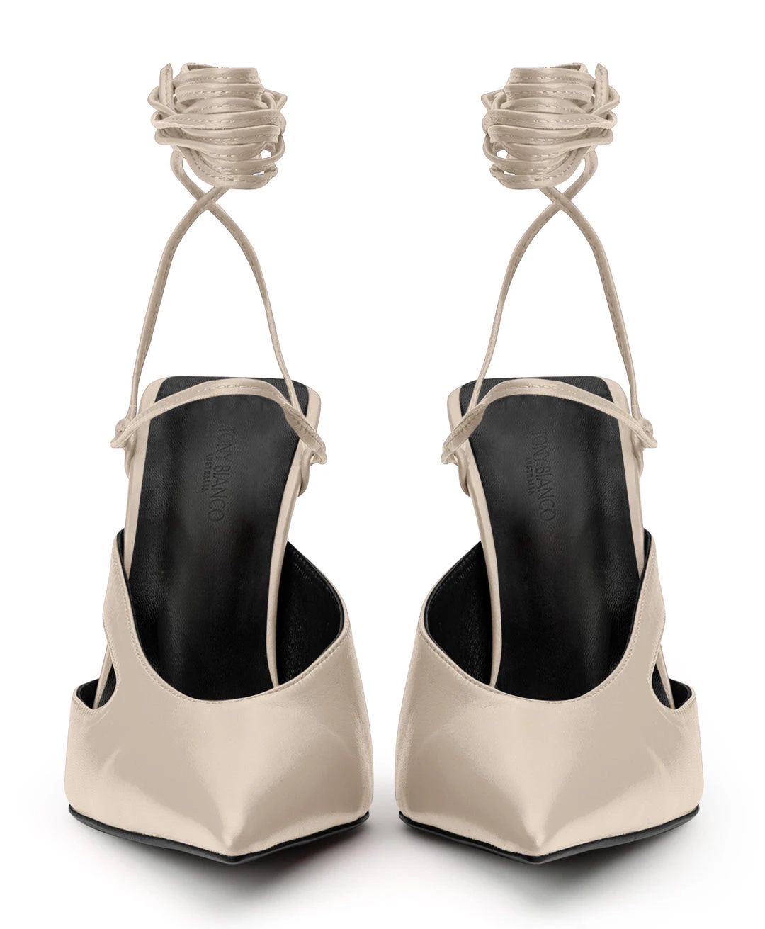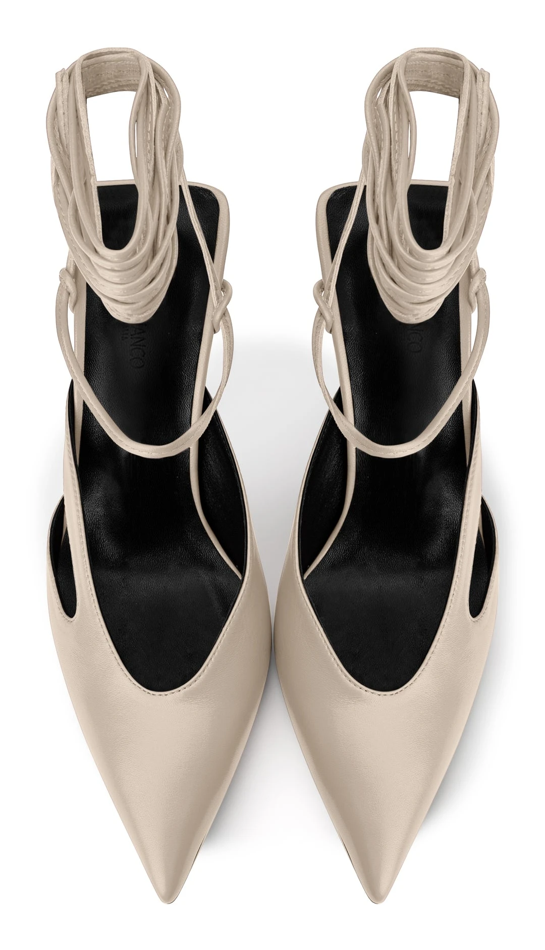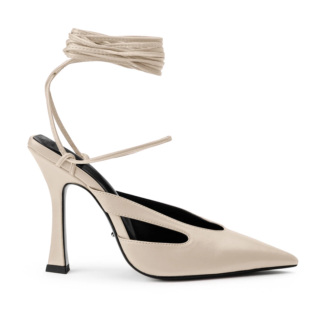 Say hello to the Passion beige leather pumps, here to shake up the world of women’s court shoes. A truly show stopping pump shoe featuring a sleek pointed toe shape, a flattering side cut-out and a wrap-around ankle strap. Finished with a tall stiletto heel.