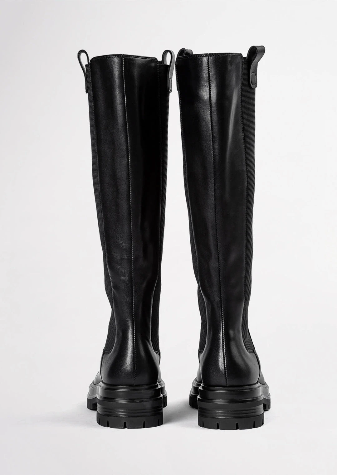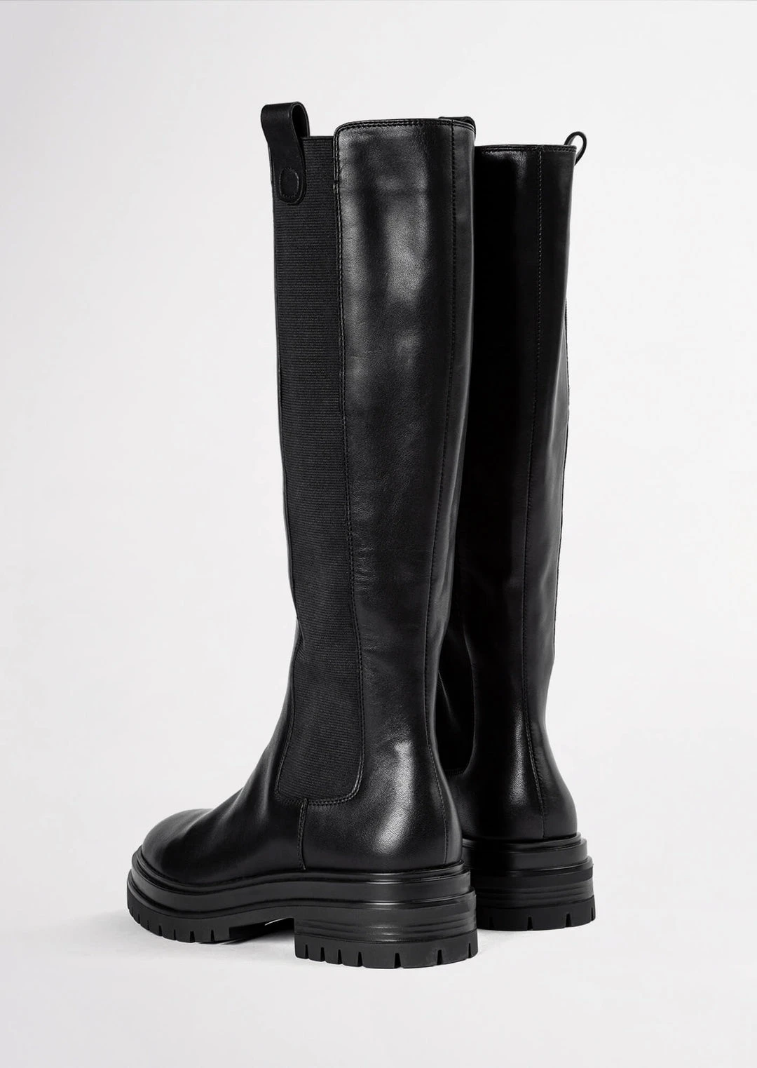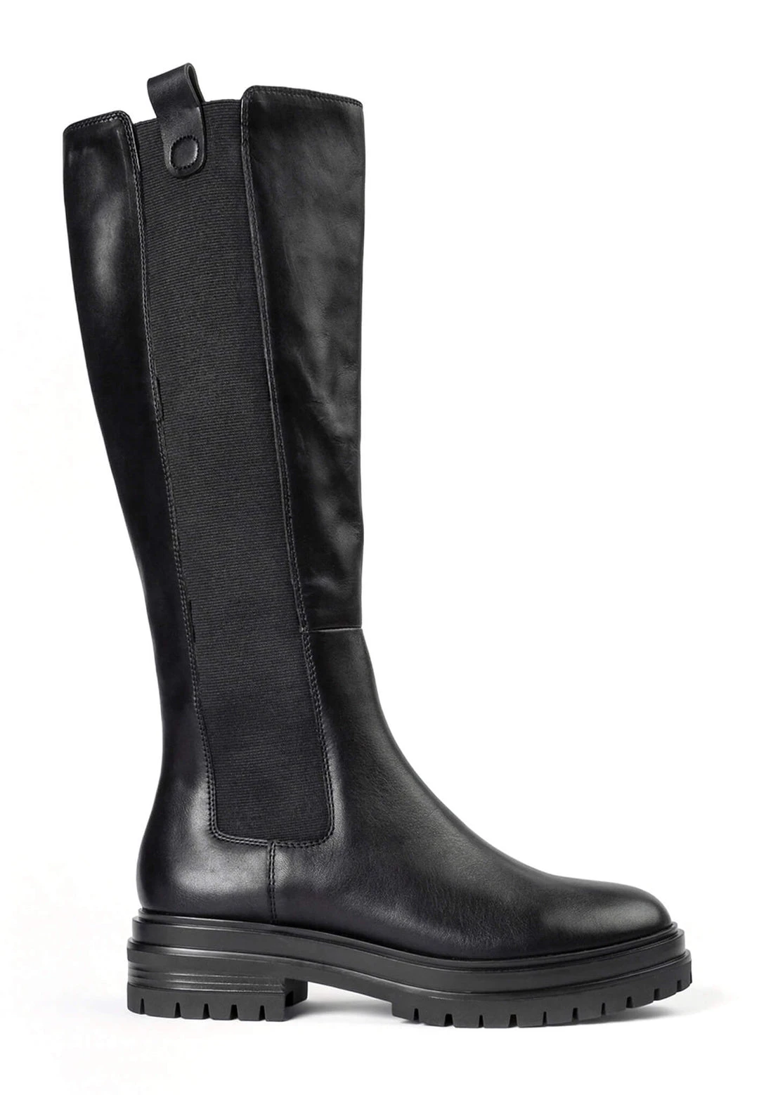 You can expect nothing but the best from our Winx knee-high black boot. Made with a premium leather upper and lining, this design features an inner elasticised panel, a comfortable rounded toe-shape, a top leather pull tab and a subtly slouched fit. Finished with a chunky exposed sole and a cushioned foot-bed for maximum comfort.
